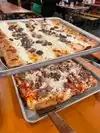We went as a group of three and ordered the tray sized pizza, eight rectangular pieces and we took home 3 pieces for later. When you add toppings they really do ADD toppings. We will know better next time to order less topping to enjoy all of the flavors. Spicy jalapeño peppers were amazing, get them with pepperoni and one other topping and you should be all set.