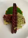 Carcioffi raviolo made with pistaccio pasta. Fair price for a top notch wine list. Don’t be impressed by the location. This is a bistro.