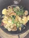 As I was in NY with a friend we met up with my son ,who had moved to NY for work and is a foodie like me He made reservations at one of his new discoveries It’s A Mediterranean restaurant with a choice of small plates to share ,covering the spectrum of all areas of food from around the Mediterranean We ordered ,the grilled octopus,the lamb tagine,the mushroom forest and mushroom flatbread ,ricotta gnocchi each of them delicious in their own way so flavorful and delicate you could taste the layers of flavor We were still a little hungry as non of dishes had any starch ,bread to lap up all the delicious sauces alas don’t serve any we ordered the paella on the suggestion of the served again fantastic but no rice just delicious delicate seafood We asked what dessert he suggested and we took is advise and ordered the watermelon sorbet with cucumber passion fruit and mint and the chocolate cake with banana ice cream Well what he said was a sorbet was more like shaved watermelon ice but was very refreshing,the star was the chocolate dessert I was very tempted to lift up the plate and lick off all the remaining goodness but as you guessed to chicken Highly recommend,would give it 5 stars but the lack of serving bread ,a must to enjoy all the delicious flavors of the sauces and the fact it was so loud hard to carry on a conversation