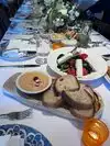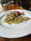 The food was quite good. Service slow. I had the white fish on a pita with a lobster ragout sauce. Nice. The bread and hummus were delicious.