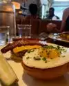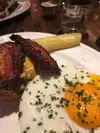 Au Cheval embodied the hip Ny rrestaurant that we saw on TV, without the attitude. We had a nice lunch there. Highly recommended when you visit NY. We went without reservation at around 1.30pm and were seated immediately. The place was decorated in an industrial/clubby ambience with wooden accent and deep leather seats. Music was fast and dominant. We ordered the cheeseburger with extra bacon and egg, foie gras scrambled eggs, thick cut bacon and general jane chicken. The thick cut bacon and foie gras dish were the bomb! The thick cut bacon was meaty, juicy, sweet, smoky, salty, tender and I am running out of adjectives to describe it. A must order! The foie gras and scrambled egg was creamy, savory and a hint of sweetness from the caramelized onion gravy. Explosion of flavors in your mouth. Cheeseburger and general jane chicken were good, but not as mind blowing as the above. We will definitely come back when we are in NY