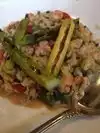 My wife, son & I had a very pleasant experience at Bar Siena for a Monday evening dinner. We're city residents and wanted to get away from the north side as the Cubs were back and things can get pretty clogged on game day/night. We met at Bar Siena for the first time. My wife & I were seated in a comfy corner booth and waited for our adult son to arrive. We were warmly greeted and enjoyed some wine. Our server was well-versed in the particulars of the libations and more importantly the food offerings (which is why we were there). We started with the Grilled Octopus and the Burrata Antipasti to get started. Both excellent, however be warned that the Burrata is a bit rich with the apricot mustard & candied pistachios and might inhibit your appetite for your main course. Great sharing plate though. Short Rib Lasagna was my son's choice, sorry no picture. It came out piping hot and he loved it. Prosciutto Fig Pizza was my wife's choice. We all got to share and it was marvelous with the pistachios and truffle honey. I opted for the Langoustine Risotto and was very pleased however I couldn't find any bud portions on my grilled asparagus; slightly disappointing. Took leftovers home and could not find room for dessert, but will next time. A very active, hip venue with a full bar. I understand there is a second floor and there was seasonal al fresco dining available. Terrific and attentive service throughout the visit. I hope my photos are OK, afraid the pizza image is a bit soft.