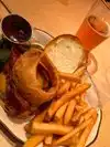 Nice American hamburger 🍔 and beer 🍺. Ee asked for the American burger with onion rings. The burger is larger than it seems. Very tasty.