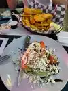 。Wedge Salad Blue cheese crumbles, diced tomatoes, balsamic, and bacon bits. Served with blue cheese dressing $10.99 。Fish and Chips $21.99 3 big beer battered Atlantic cod fillets deep fried to perfection. Served with steak fries, coleslaw and tartar sauce Wedge Salad is good, it can be full for me. Waitress is good too.