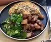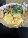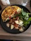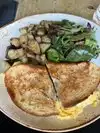 Best omlet I have ever had. Called “tailored omlets” - You can select up to 5 add-one - so i chosed chicken, roasted peppers, kale, spinach and cheddar cheese. It was thick and just so flavorful. The dish came with the perfect amount of roasted potatoes (about 8-10 cubes and a wonderful wild leaf salad with a very very Light oil/vinegar dressing on it. Healthy and filling. Also had a protein shake (vanilla whey) called Queen of the jungle - with kale , spinach, banana,?and OJ. Yum!