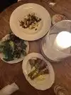 ask to be away from stairwell. good vibe. Attentive service. So so bread. Excellent octopus and beans. Too salty but tasty mushrooms and ravioli. Bobo salads heaping and fresh. Good clams and mussels. Go to hidden small bar upstairs for a martini and oysters.