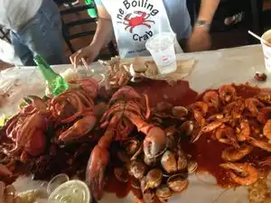 boiling crab doesn't lack for business; their food choices are simple and short enough and clean-up, for them, is easy as you get to be primitive or back to basics of using your hands. should've asked but didn't if any of their seafood is fresh. would surmise that the seafood was previously frozen. the seasoning is simple choices as is your choice of "heat". for me the mild spice is still too much. if you can eat a lot your bill can rise quickly. if you are reasonable in the amount you order your bill won't be too bad. there are many eateries where you can eat with your hands and is not limited to seafood and you may not have to worry about if the seasoning color will stain your hands. face, lips or tongue. this was a different enough dining experience but not a place I would consider as a regular stop.