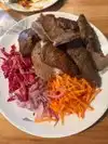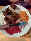 We ordered the chicken sis kebab with rice. We substituted the red cabbage, pickled beets and carrots for a garden salad with carrots. However, most of it came with a lot of onions. Regardless, the dinner portion was very good with rice and 6 pieces of cubed boneless chicken breast. We also ordered 2 dips, the cucumber yogurt and humus in order to dip our chicken. It does not come with any pita or bread. We found that the dips are little overpriced. Food was delicious! The atmosphere is very nice and of Turkish/Mediterranean design. Service was good.