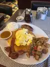 We just happened upon this place and we were so lucky to have. We went for the New Yorker breakfast and the double stack cinnamon bun pancakes with a side of bacon washed down with black coffee. The eggs sunny side up were done to perfection whilst the italian sausage with its fennel undertones was a great taste,home fries and brioche toast the same washed down with fresh OJ,the pancakes wete thick and fluffy and engulfed most of the plate and delicious. We barely ate the rest of the day as this was sooo filling and very reasonable on the wallet. Service was on point and friendly refilling the coffee in an instant.