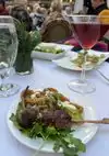 The location of Bryant Park Grill is very pretty, overlooking the park. We had reserved an indoor table, but when we arrived, they stated brusquely that the inside wasn't open; we could sit in the tent or outside. Since the weather was nice, we opted to sit outside. For appetizers, we ordered the Moroccan lamb kabobs, which were super tasty, as well as the cheese trio, which was a really good quantity and nice presentation. The steak frites was pretty good, and the branzino was even better. I had the seafood in cioppino sauce; my fault that I didn't know it was a tomato-based sauce (which isn't a favorite) and that the mussels and clams all came in the shells. One of our group didn't find anything on the menu that he could really eat, so we asked about various alternatives. "You need to order something from the menu" was the only answer. I've never really been somewhere where they weren't willing to make some accommodations or combine some ingredients to help... The food and the location are good, so overall, we would come back with a different group of people and probably just expect less courteous service.
