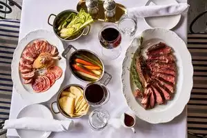 Same menu, as the staff will tell you. Just not as fancy, but if you are going for the food, either wait in line or head downstairs. We did and happy that we did. Hard to pass on the sausage dishes, but the wiener schnitzel coming to a tavle neargby made me drool. Compact wine selection, but a nice compliment to their menu.