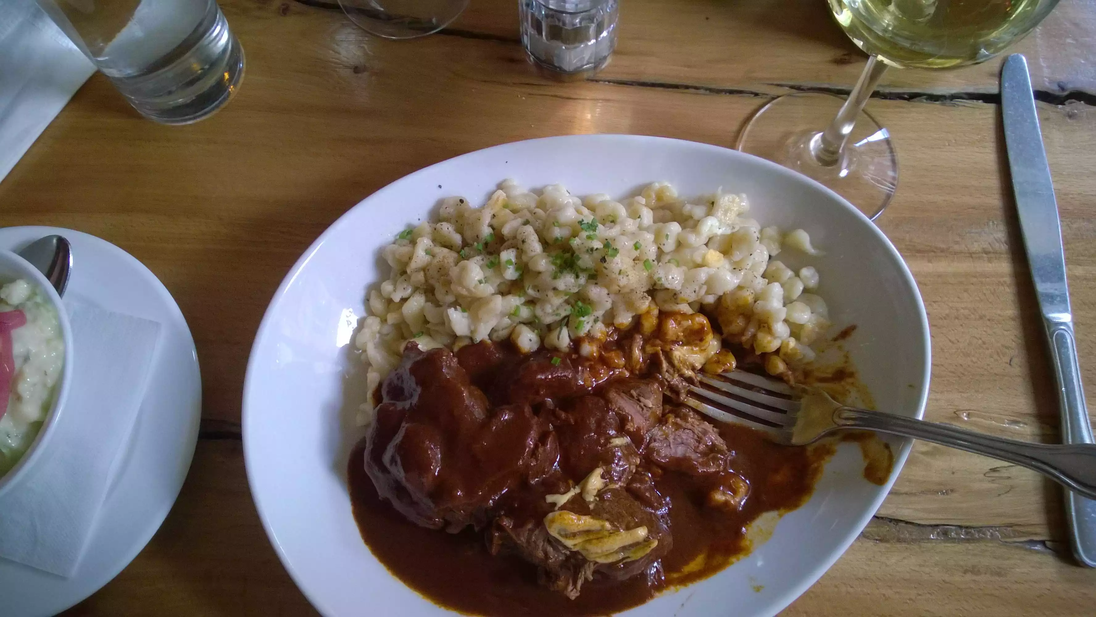 My companion and I arrived at this restaurant with moderate hangovers. We were greeted by an extremely nice member of staff, who provided relaxed, friendly (but very efficient) service. The food was delicious, particularly the spätzle: the best you'll find this side of Salzburg. We passed on dessert as we were so full from the main courses, but were then treated to a complimentary shot of cinnamon schnapps, which rounded off our enjoyable experience. Many thanks to our server; unfortunately we didn't get her name. And well done to the chef: the food really was delicious, and beautifully presented.