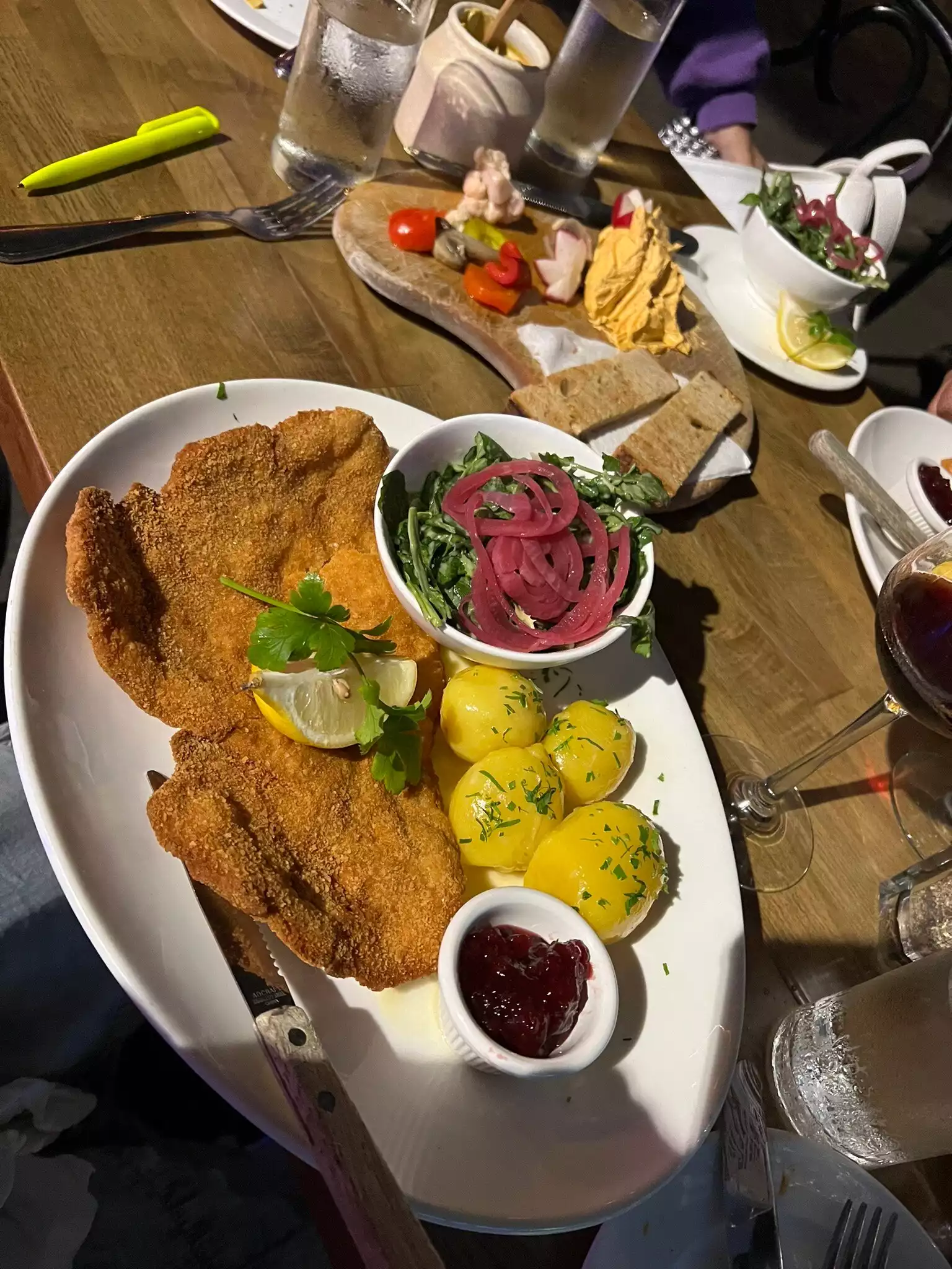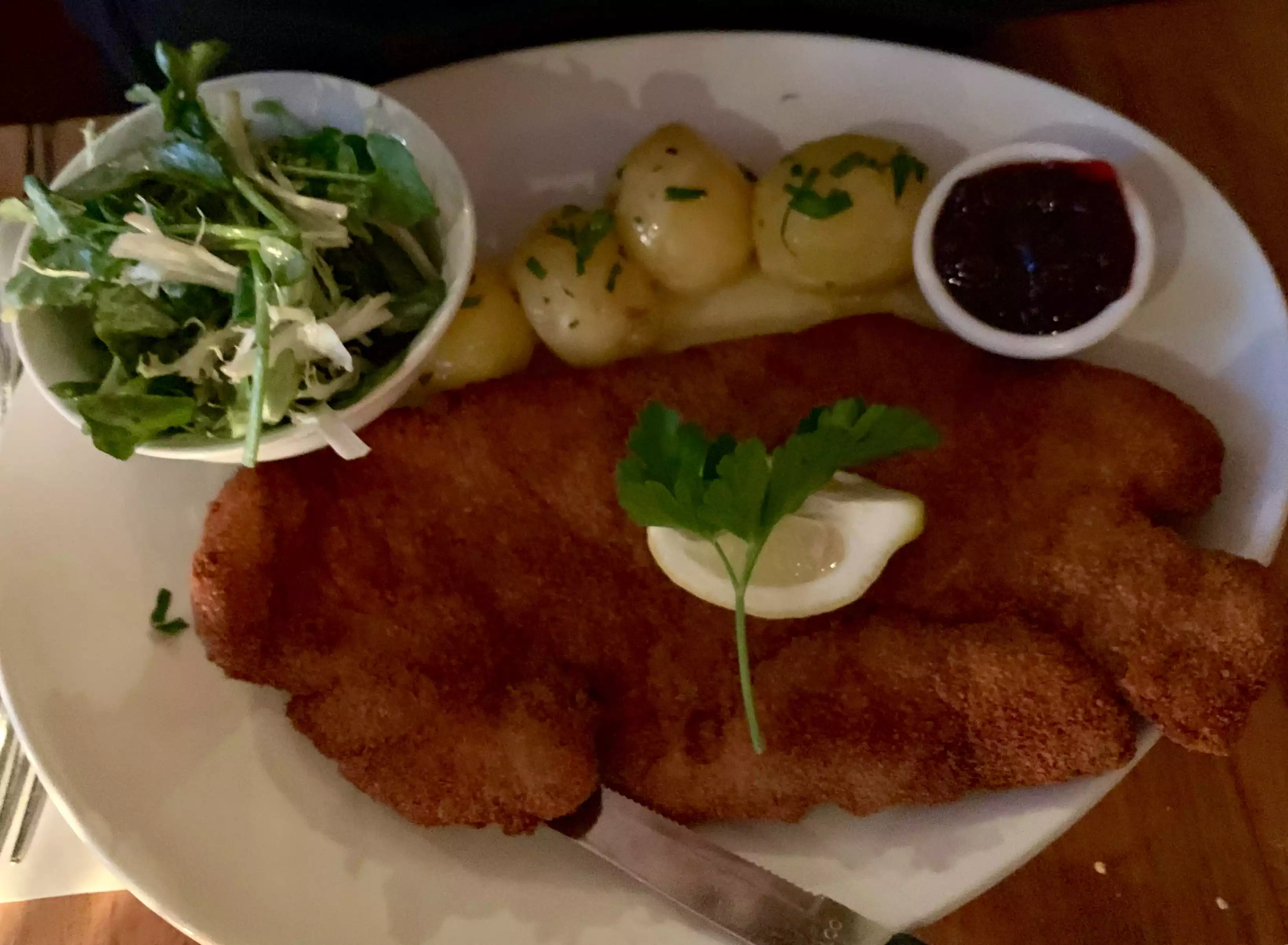 The waitress who serve me could’ve been more welcoming Even a bit of a smile would’ve been nice for being greeted by somewhat surly waitress did not help my mood. The major appointment would come with the food. I was really looking forward to having some schnitzel since my mother was from Slovakia and my father from Austria and I’ve had great schnitzel both in my native Australia, as well as Austria and Slovakia and it’s very hard if not impossible to find a restaurant that serves this in Los Angeles. Suffice to say I was incredibly disappointed. The veal assuming it was veal was very tough and overly thick schnitzel is supposed to be thinly pounded. It was also very, very salty. The best part of it was the potatoes and the lingonberries.
