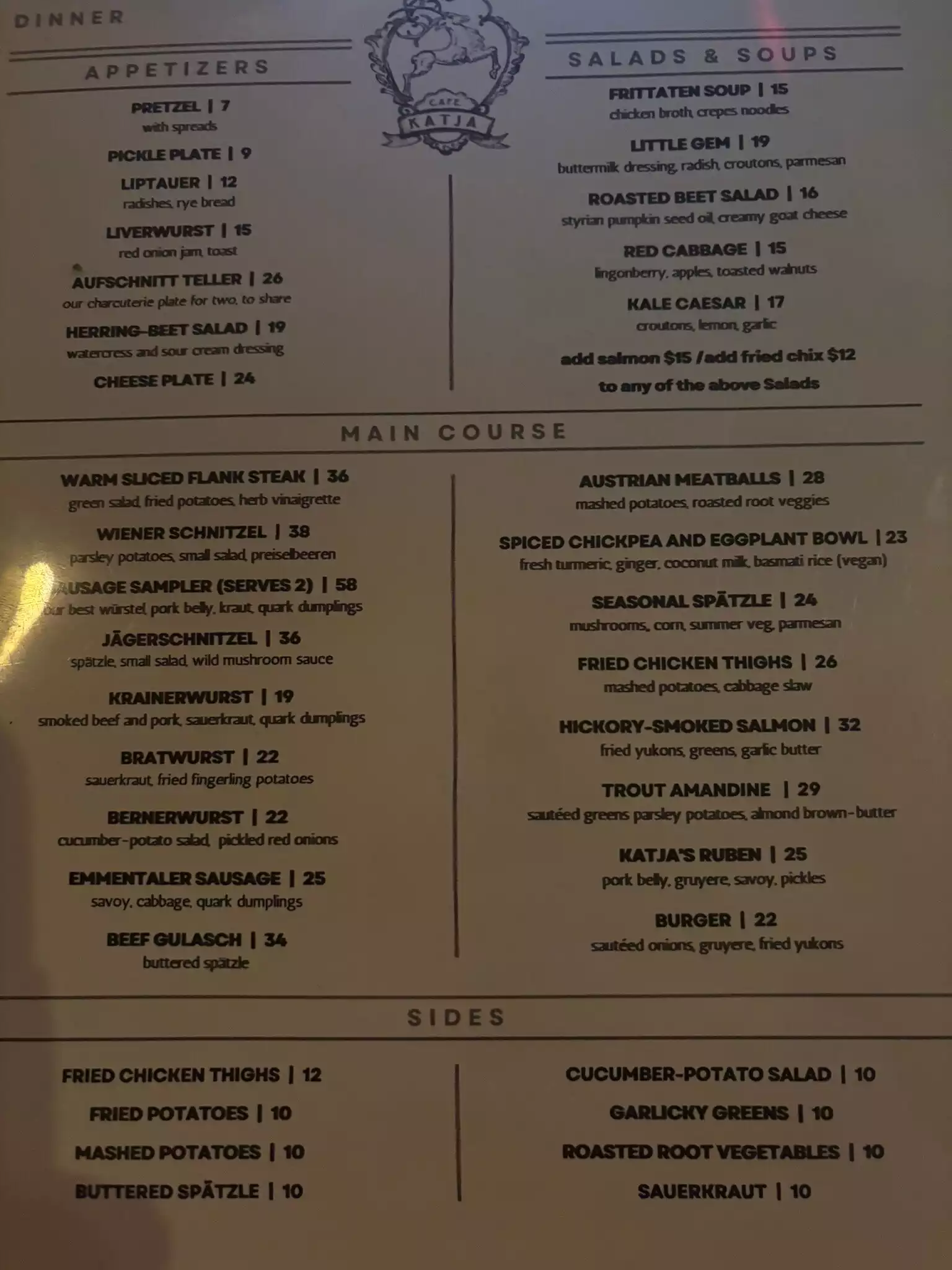 I've been to Cafe Katja numerous times inst the last several years and can say that absolutely nothing has not been rather great. Austrian meatballs are brilliant. The schnitzel is crisp and juicy. The seasonal specials are always special. The housemade sausages are always a great option. The only "negative" I can say is that there are not too many lighter options, but then again that's not why you should be eating there. Just try it - you won't be disappointed.