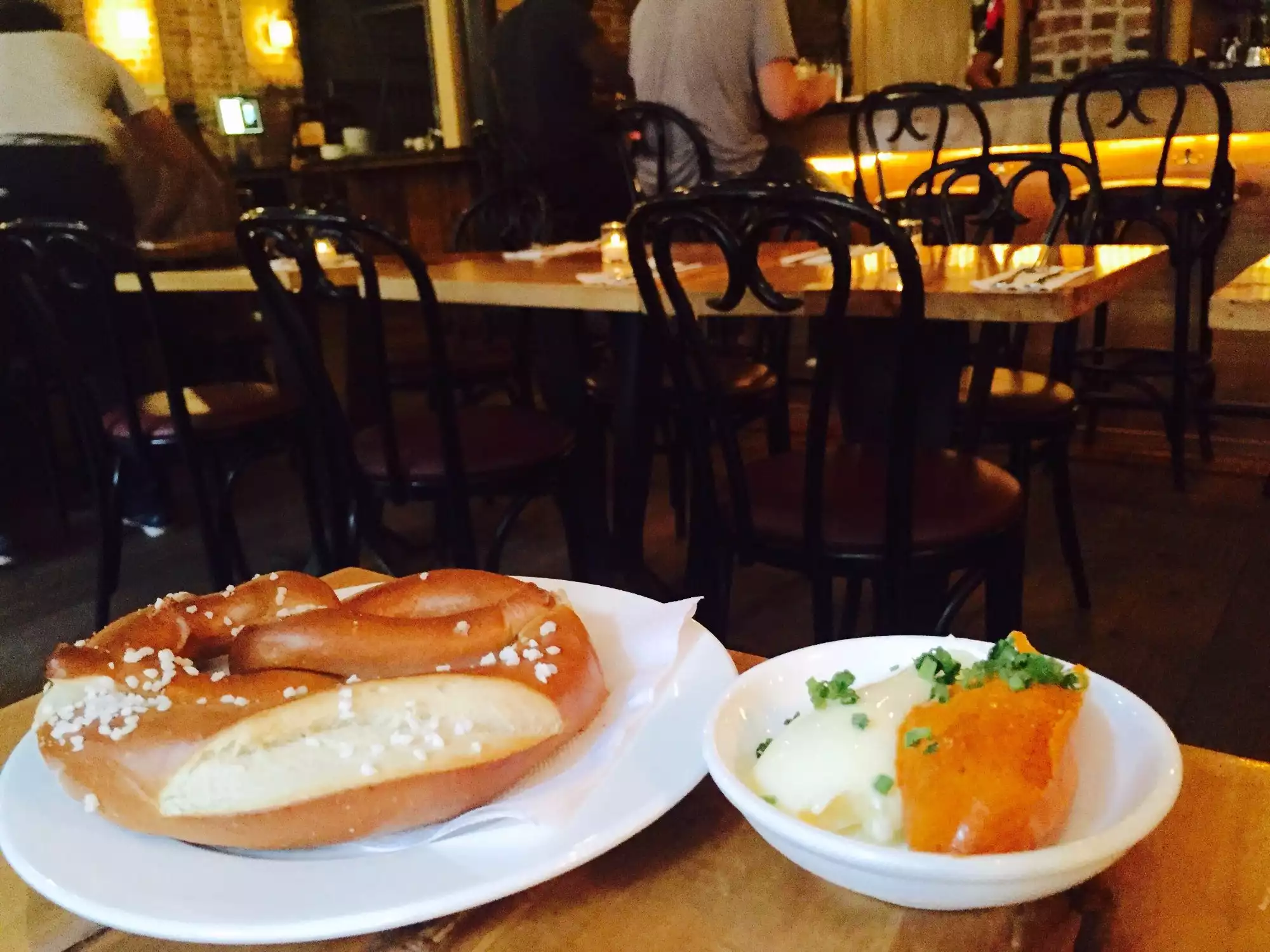 I was solo in NYC and staying around the corner from all the restaurants and bars on Orchard Street on the Lower East Side. I checked out ratings and reviews of the restaurants and stopped my search when I read about Cafe Katja. I love Austria and authentic Austrian food and wine, so I wandered over to see if I could get a table for one. They were moderately busy because it was a Sunday night, so I was seated quickly. The hostess was very nice and sounded amazed when I said I have travelled to Austria 6 times and loved the country, the food, and the people. The staff were attentive and friendly, and the Gruner Veltliner wine choices were reasonably priced, if not very broad. However, the star of the show was the food. The pretzel appetizer with seasoned butter and soft cheese melted in my mouth and transported me back to a lunch I had in a mountain hut after a hike in Alpine meadows outside Salzburg, and the Weiner Schnitzel with lingonberry sauce was as good as any I had in Vienna.