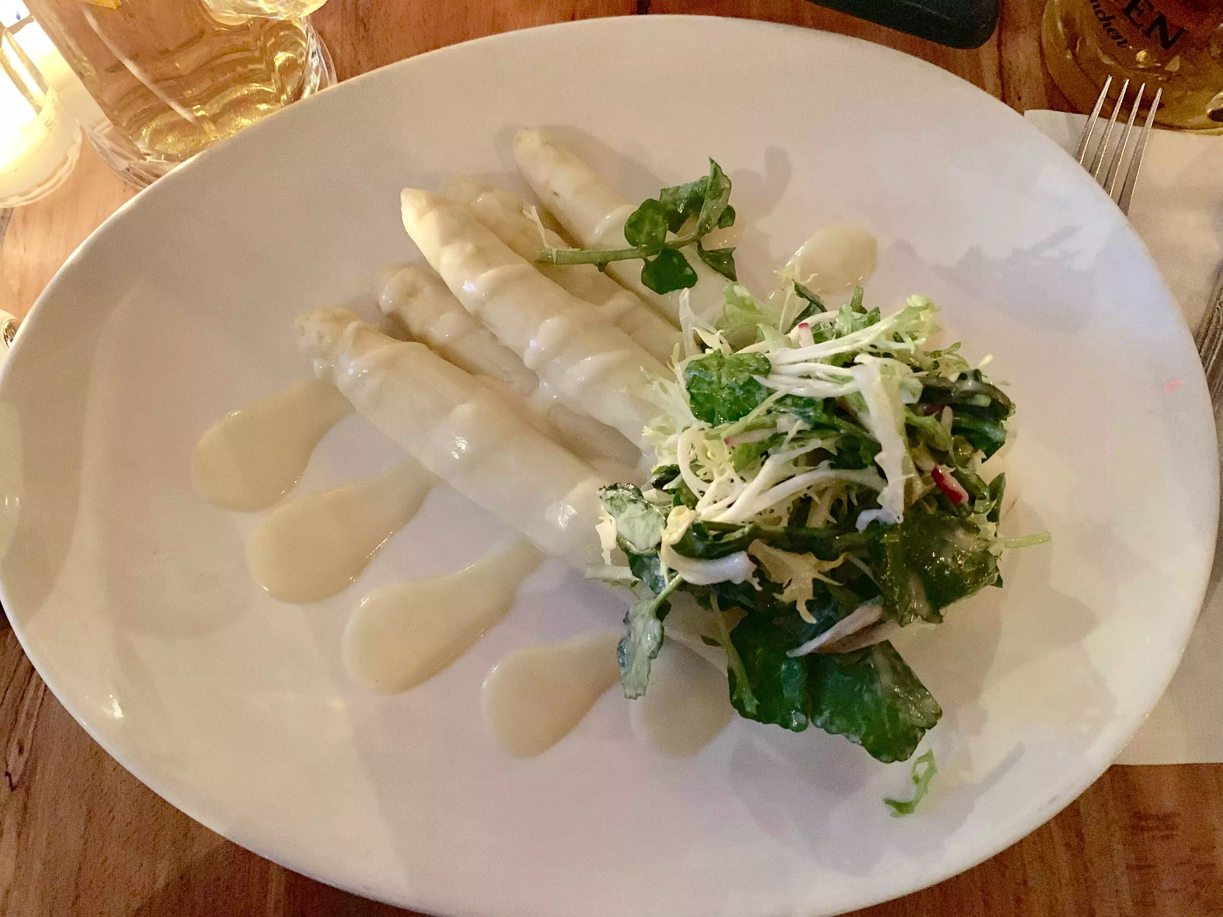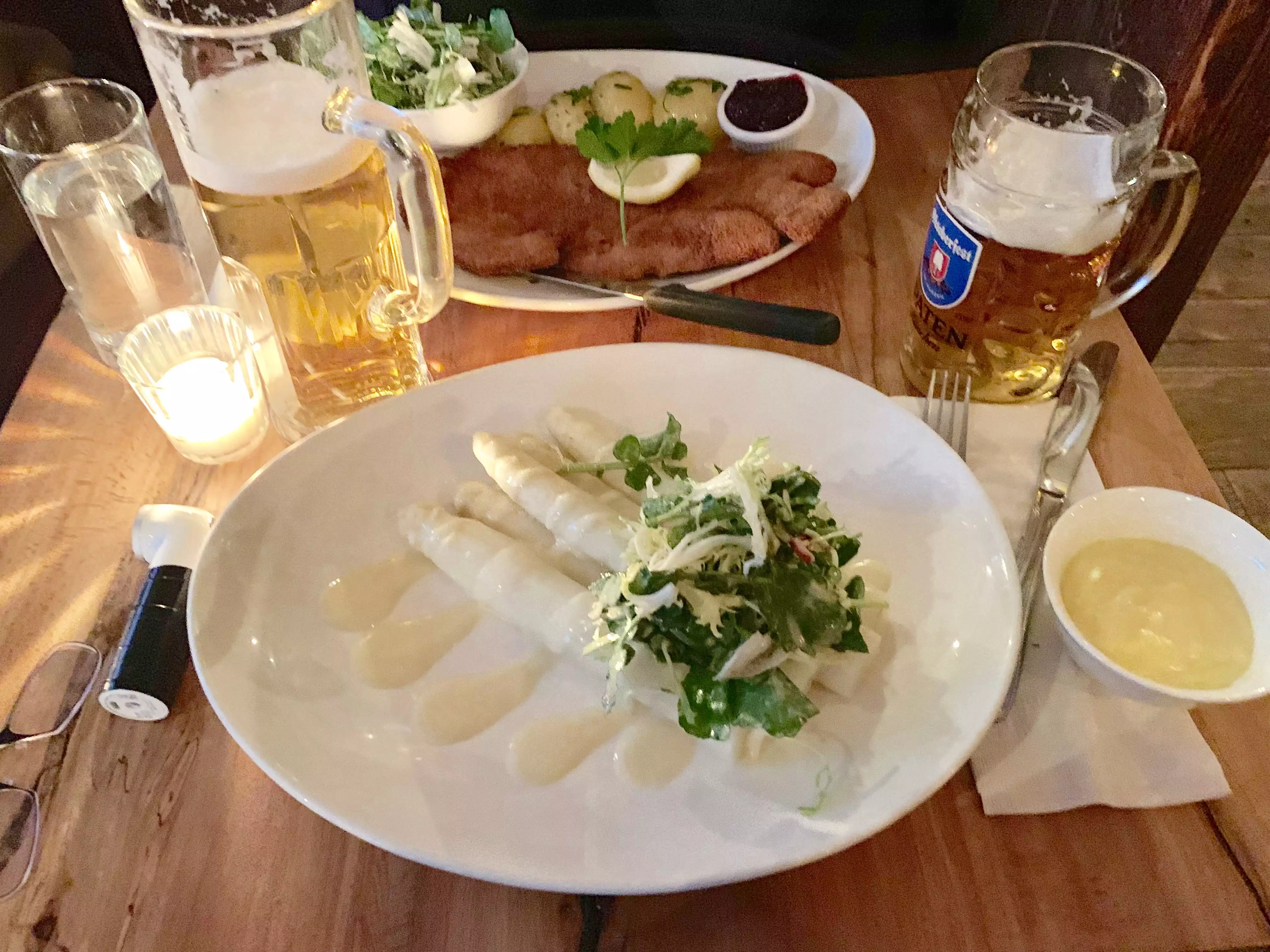 Nice asparagus menu,the best thing about spring time. A party of four had all different dishes and we're all happy! Nice German beer or wine to go with it.