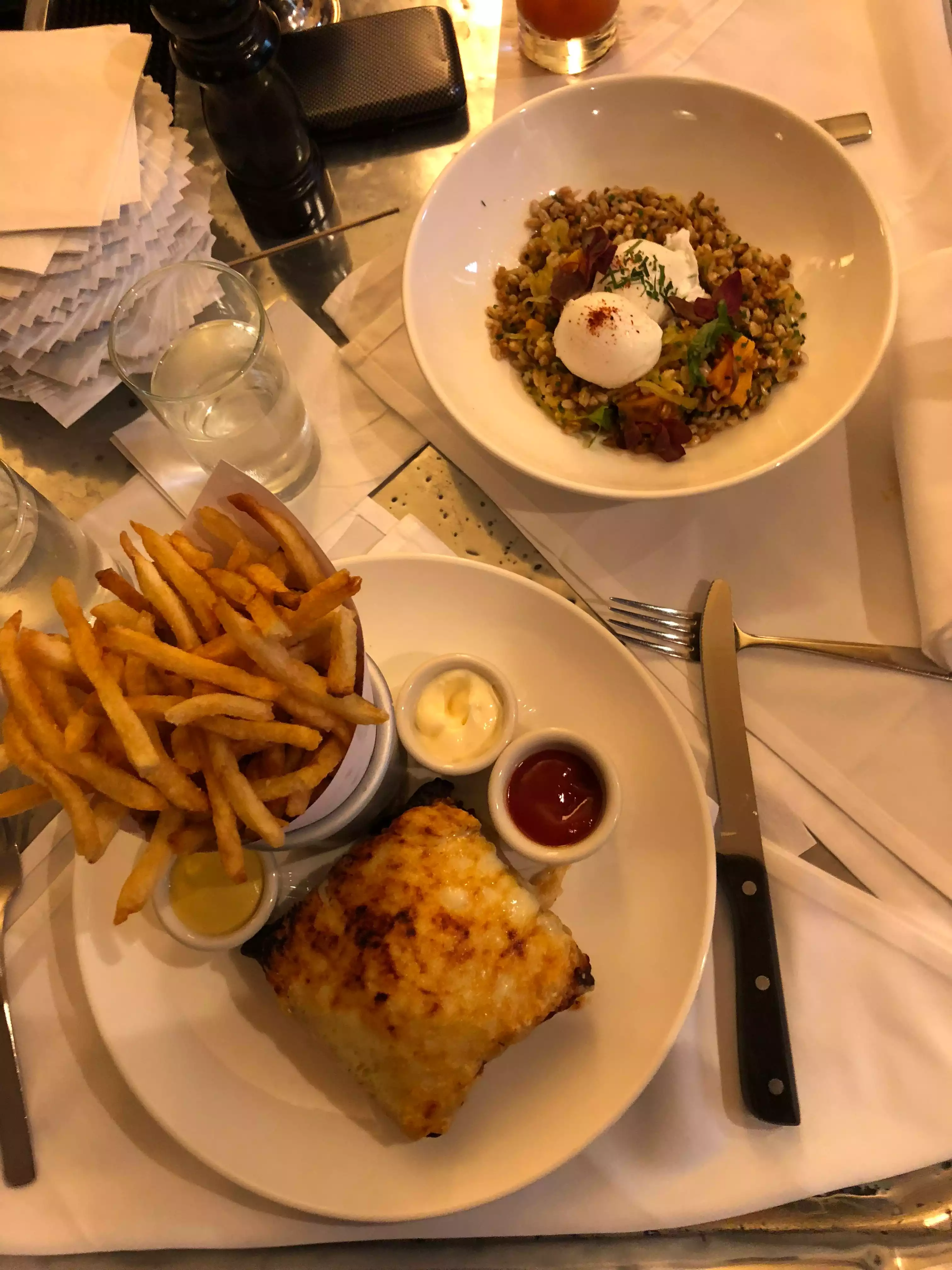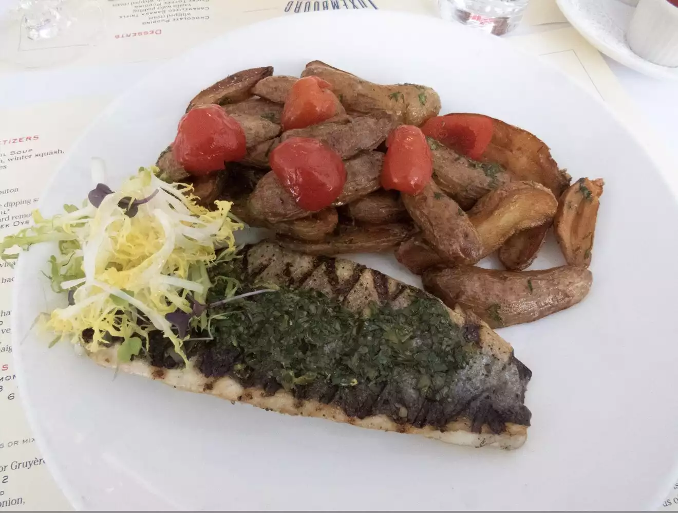 This was a family meal. My daughter ordered a salad (Caesar?) $19 for a few leaves of lettuce and & $11 for a small chicken breast. Grilled cheese. Nothing special was $23. I had fish and chips that looked suspiciously like fish sticks. Croce monsieur was the best of the lot. $12 bottle of beer and something exorbitant for soup rounded out the meal. ($18 for onion soup) $ 200 for four for dinner wasn’t worth it. It was cold outside and the heater wasn’t helpful. They would not seat us in the enclosed outdoor dining area supposedly because there were reservations but three tables remained empty until we left. Also, this has nothing to do with Luxembourg.