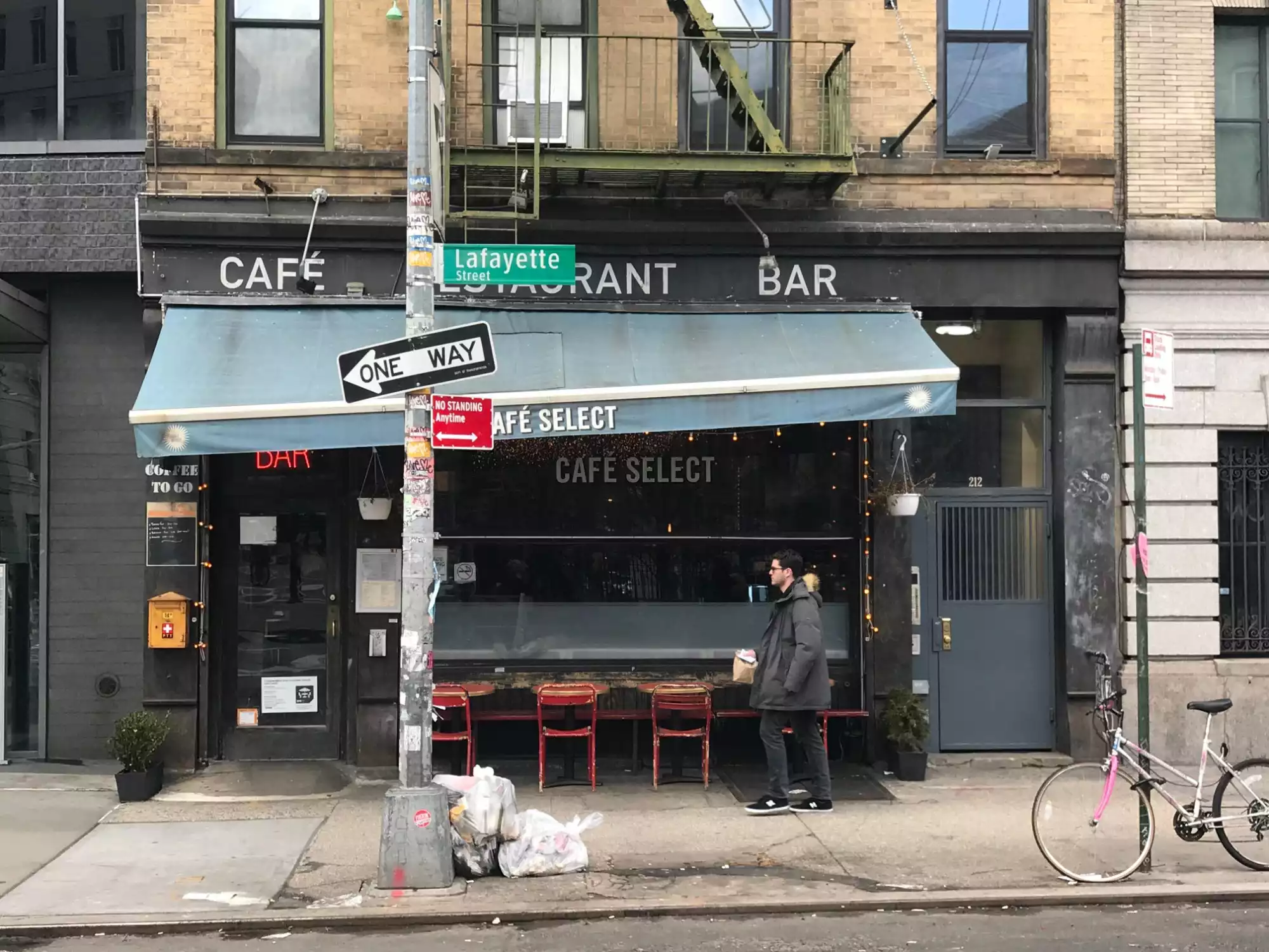 TripAdvisor should introduce 3,5 Points ;-) We were sitting in the little Petrosino Square park high on sugar from Eileen's Special Cheesecake when we got a little bit cold and spotted Cafe Select across the road and decided to go in. The place looked as nice from inside with lots of ittle lights hanging from the ceiling that created a cozy atmosphere. It was around 5/6 pm and we immediately got seated but were told they'd need the table two hours (!) later because there was a reservation; some people might find that off putting as it might make feel them rushed to leave the place, thus ruining the dining experience. This review isn't fully representative as we only had a smaller menu but everything was perfectly fine. The food and drinks were served quickly by a very busy yet very very friendly and attentive male waiter, were quite cheap for New York standards and the soup of the day was pretty yummy as well.