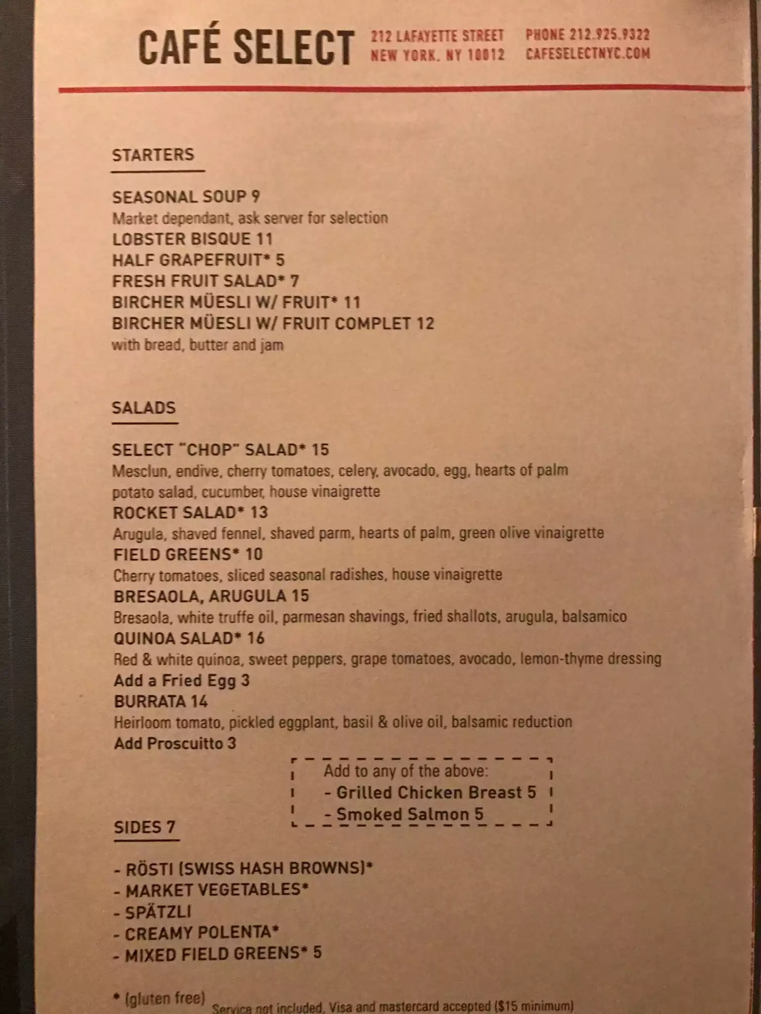 We were in town for the Van Morrison show the following night; had Saturday to kill, but the weather was terrible; rain from Hurricane Mathew. We roamed to Soho from the meatpacking district and took a stab at Cafe Select - There was not a line among the rain and other cafes with lines. Shame on those people. The entire scene was fantastic; no line; excellent service; great seats by the front window, and incredible food!!!!! Gene had the Halloumi cheese plate; and Fannie Flagg had the incredible cheese sandwich. Best kept secret in NYC! Gene