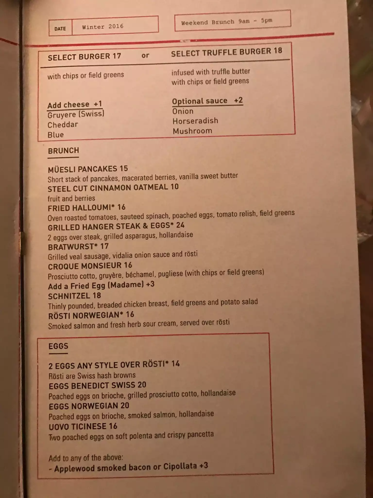 The restaurant is really nice, even if tables are a bit small. I would recommend to book as it's often crowded. I tried a rosti with a sausage but it was not so good because was burnt. Prices are consistent with NYC standard, but I found out they charged me a higher tip