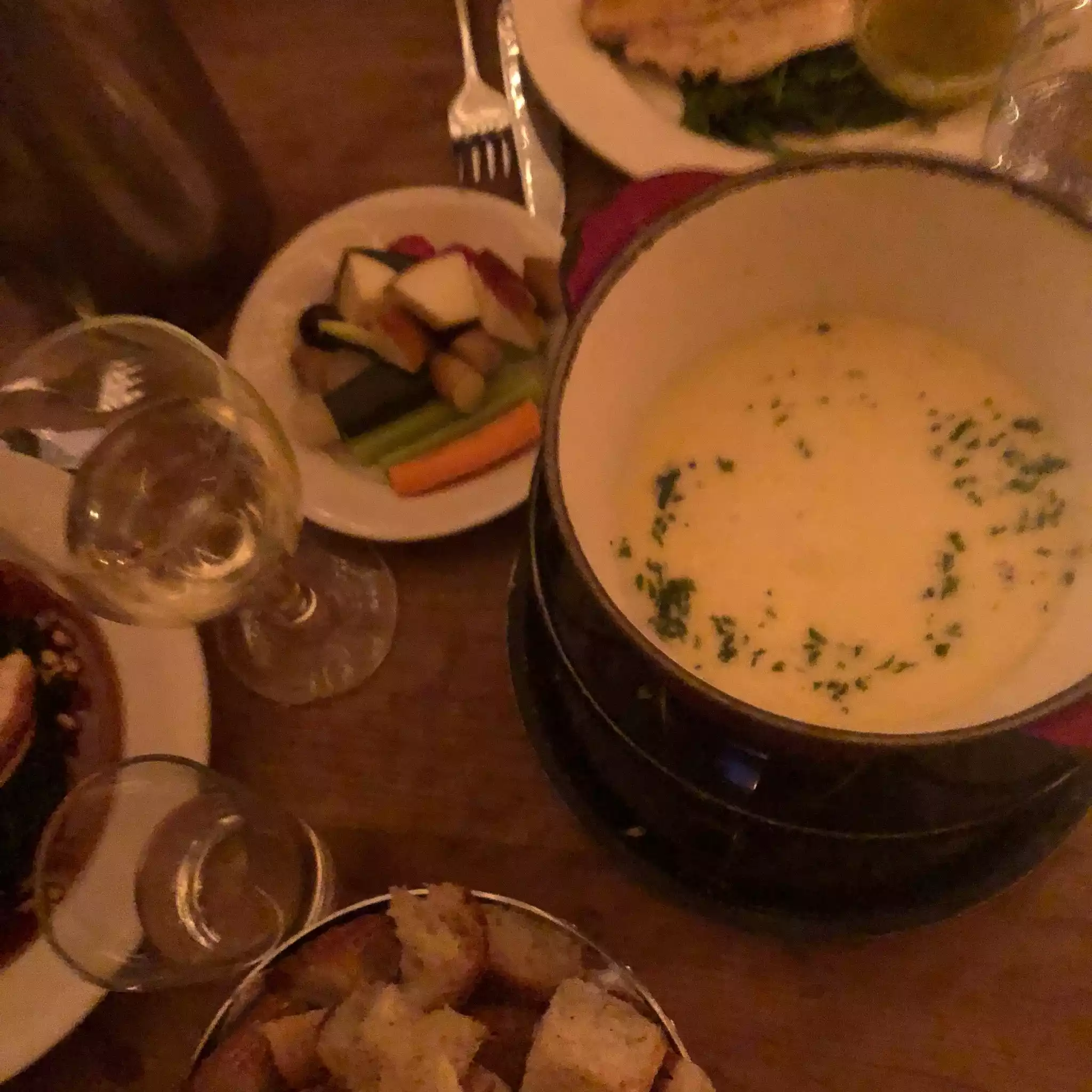 Based on reviews I had high hopes for an authentic Swiss cheese fondue. The sides were weird (grapes) and under cooked (Raw potato!). It totally ruined the experience.