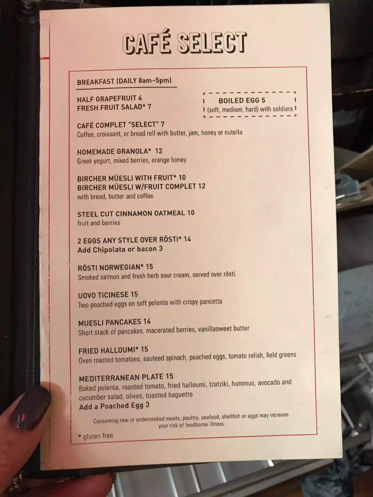 we were staying in a hotel nearby and went to Cafe Select for breakfast. Interesting egg choices, fresh oj and good coffee. Atmosphere very comfortable and really enjoyed our relaxed meal!