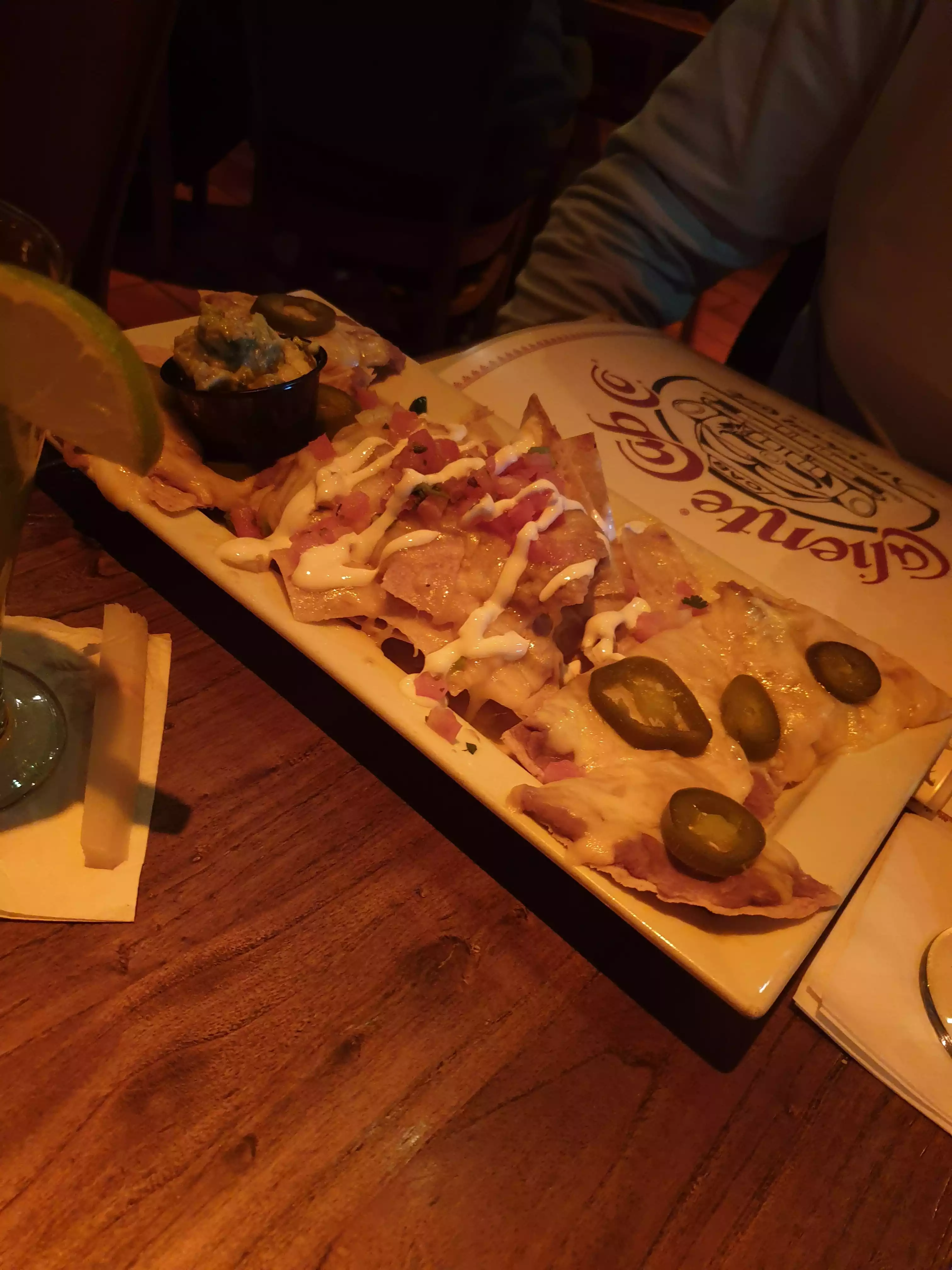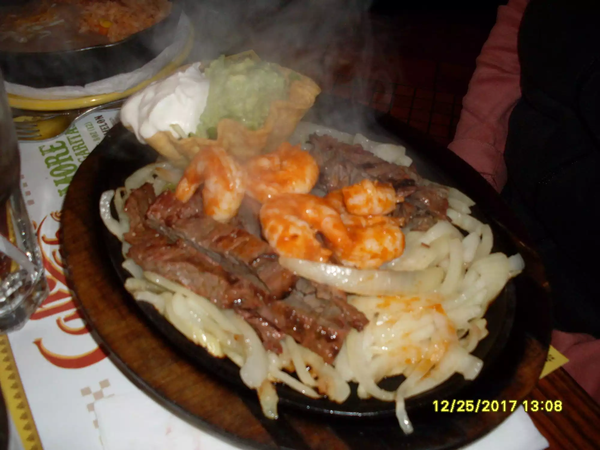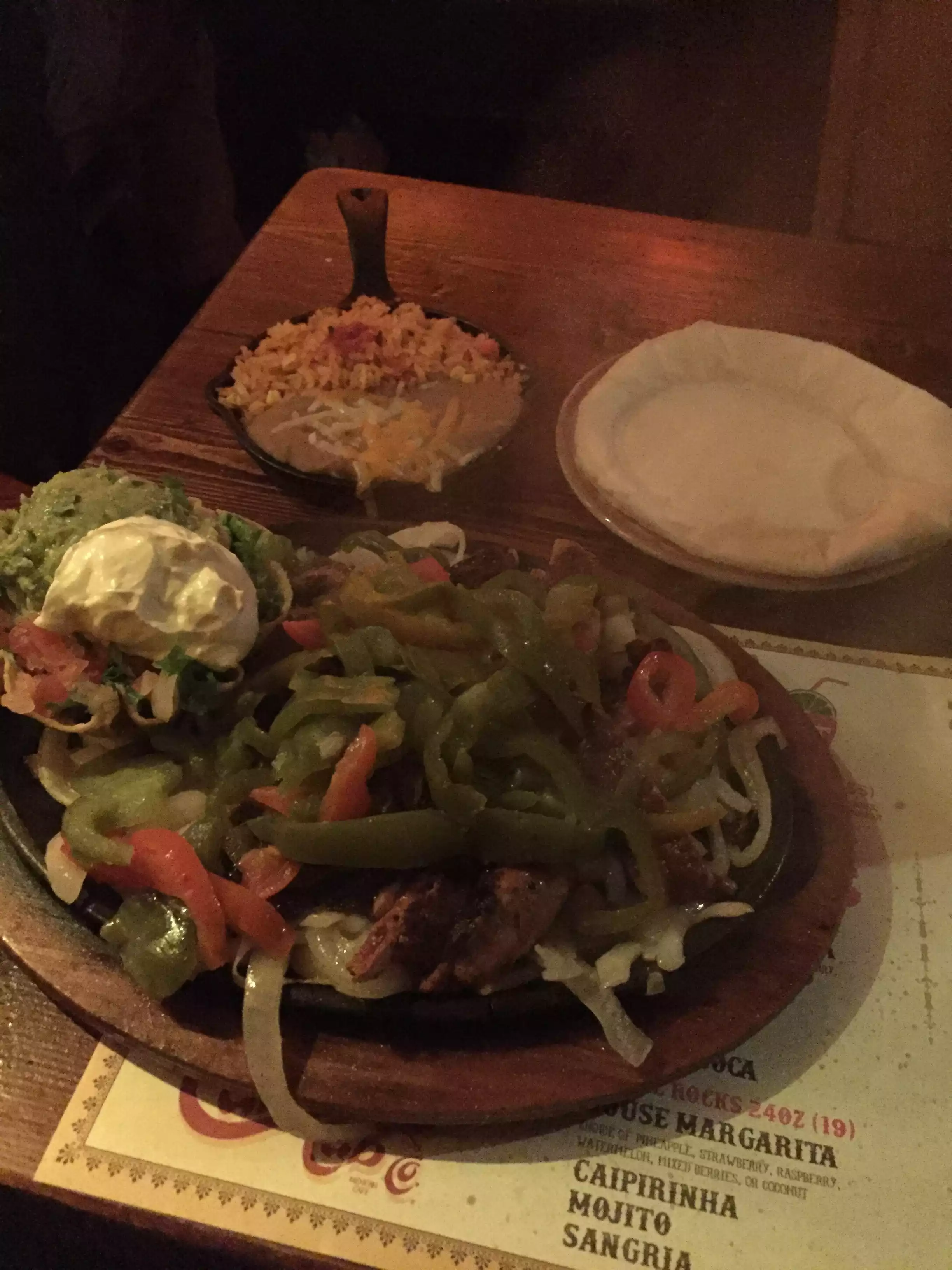 We got a recommendation for this Mexican restaurant from colleagues and gave it a try. Had nachos for starter. Drowned in cheese. As a main we chose the sizzling fajitas. One with beef one with chicken. Added peppers which were just boiled. Too little spice on meat, tasteless guacamole and salsa. We prefer the salsa, sour cream, guacamole etc seperately but got it served all -in -one -pot. Made it greasy. The dark surroundings made it hard to see what we actually ate. Too loud music made it difficult to have a conversation at the table.