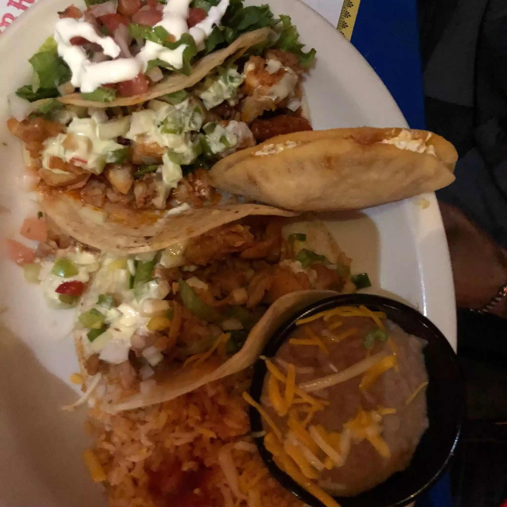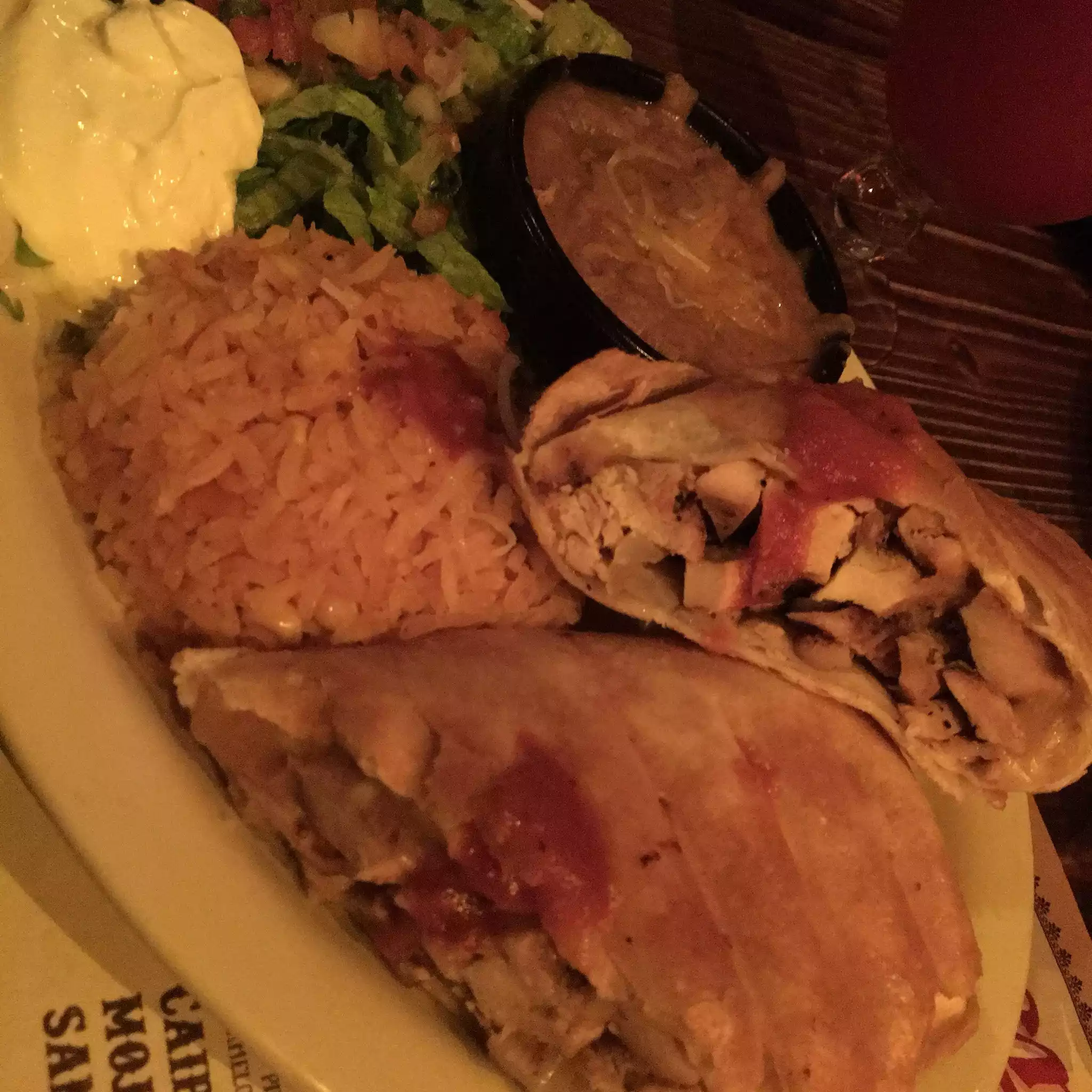 My boyfriend and I as well as our friends who are also a couple came here over the weekend.. it’s a cute spot, dimmed lighting, some music playing.. But anyway the appetizers we shared was really good! Some nice fresh guac and chips was amazing and we also shared the chicken queso dip which also was delicious! I would deff recommend getting either of those when going, and the drinks were very good, we got a frozen Esposa loca with mixed berries or something like that, it was big. The only thing is wasn’t crazy over was the chicken in my main coarse meal I got the chicken chimichanga which came with a side of rice An refried beans with a dallop of guac An sour cream which was good. But I’m picky when it comes to chicken, if it was shredded chicken it would have been a really good chimi but it was chunks of chicken An I get grossed out with like squeaky chewy chicken.. but overall it was a cool little spot to eat at!