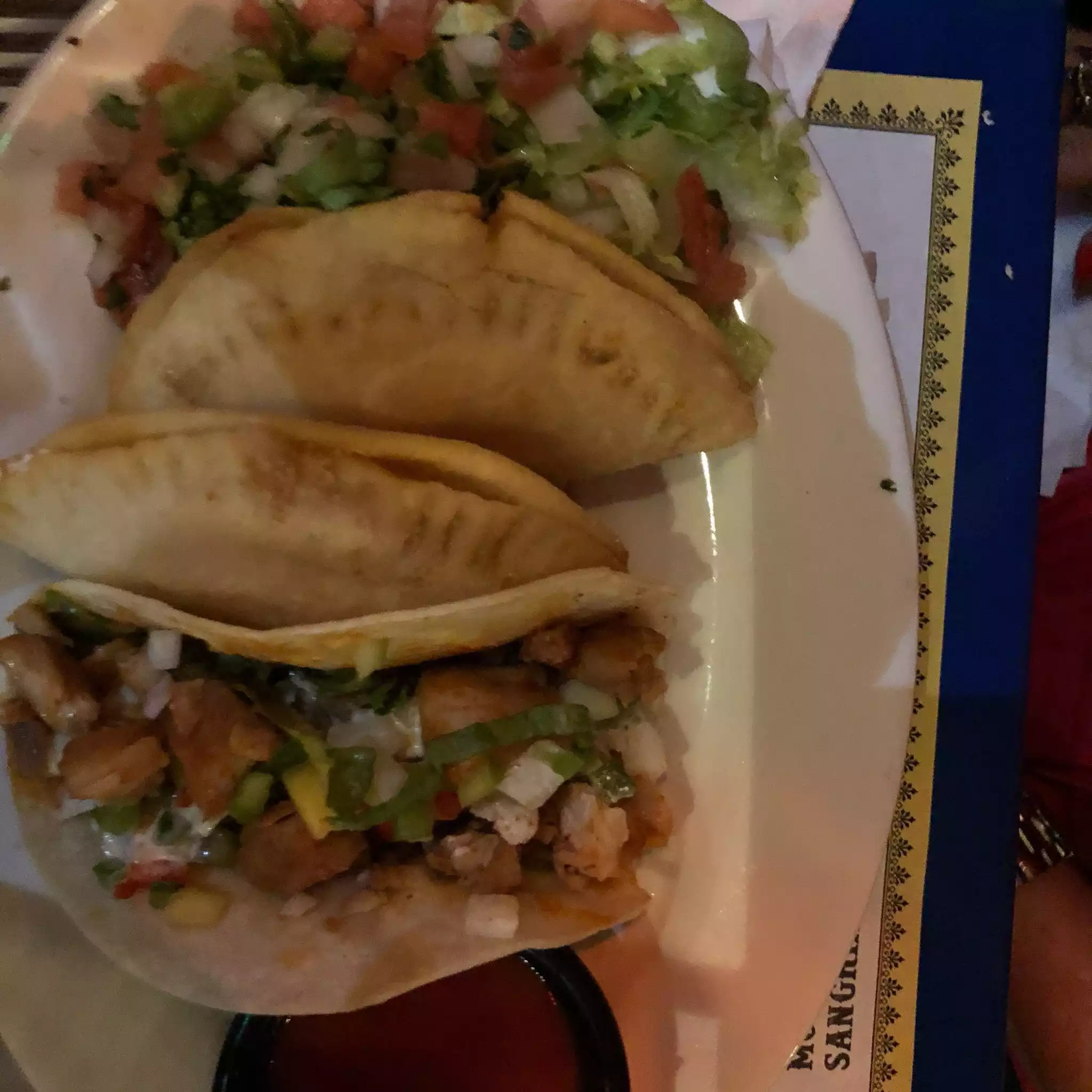 I recently went to this restaurant on Saturday for date night. Let me start off by saying this if you are looking for a nice place to eat this isn’t the place for you. So the waiter we had was rude and seemed like he was in a rush. When I asked him a question about a emailed promotion saying i get a free house margarita on my next visit mind you the promotion was emailed to me on Tuesday for signing up with not expiration date. The waiter says rudely oh this it’s over where not doing it anymore. Now Normally I would’ve left but I wanted to give this place a chance a chalked it up to him being here all day so I stayed. When it came time for my boyfriend to order his drink the waiter reaches over him and crosses out the drink he wanted with his pen. My boyfriend said he’s fine he didn’t want anything so we shared my drink I got which was a 24oz margarita. When our food came the chicken taco was dry and taco shell was hard the only good thing was the steak enchilada and corn. I’m giving it 2 stars because I went to the hostess and told her about the email I had and give me the free margarita and the people we met there was nice and got us a free giant margarita. I wouldn’t recommend this place for anything else besides the drinks that are over priced.