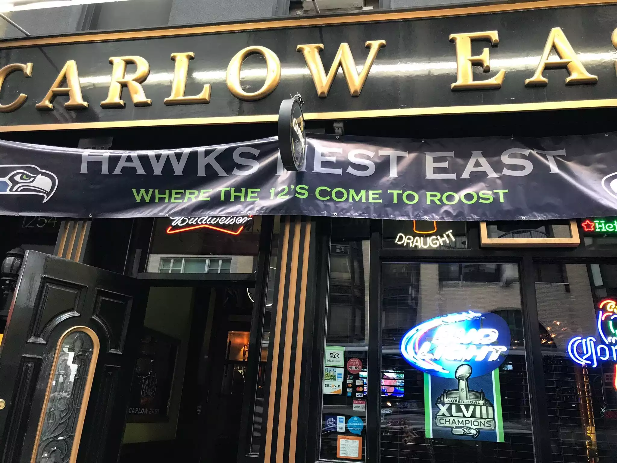 My wife and I were walking to the subway and happened upon Carlows East again on or way to the Yankees game. Stayed to watch the Hawks beat the Rams then off to the stadium!! The place to be to watch the Hawks!!! SEA.....Hawks SEA.....Hawks SEA.....Hawks SEA.....Hawks