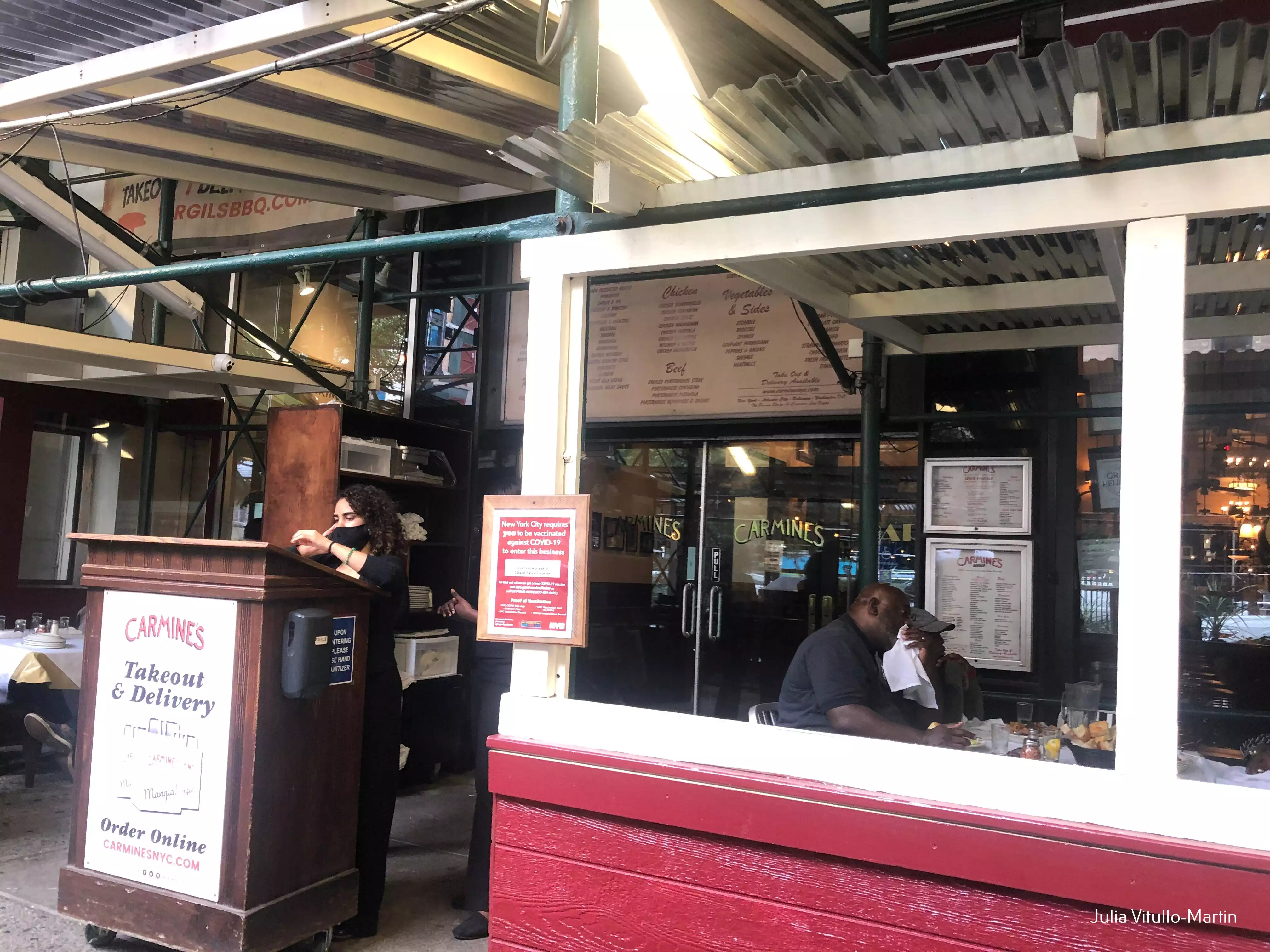 You don't go to Carmines for haute cuisine or fine wine. You go to eat a lot of comfort food with good friends. The service is always friendly, the portions beyond generous, and the seat socially distanced enough to let you relax. We always eat outside, which can accommodate groups easily, expanding as new friends arrive. There was a recent, much-publicized incident with 3 women from Texas assaulting a hostess (weird!) but New Yorkers rallied to Carmines, which took the whole thing in stride.