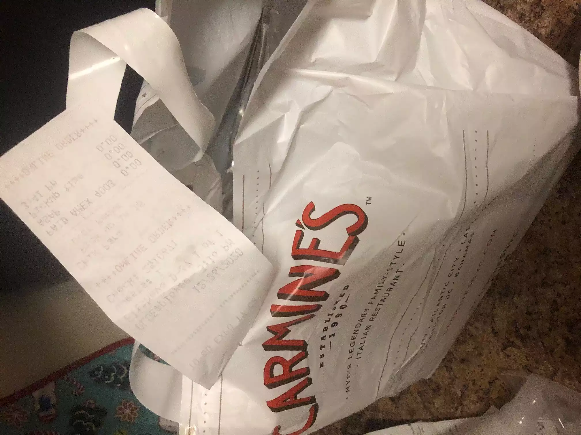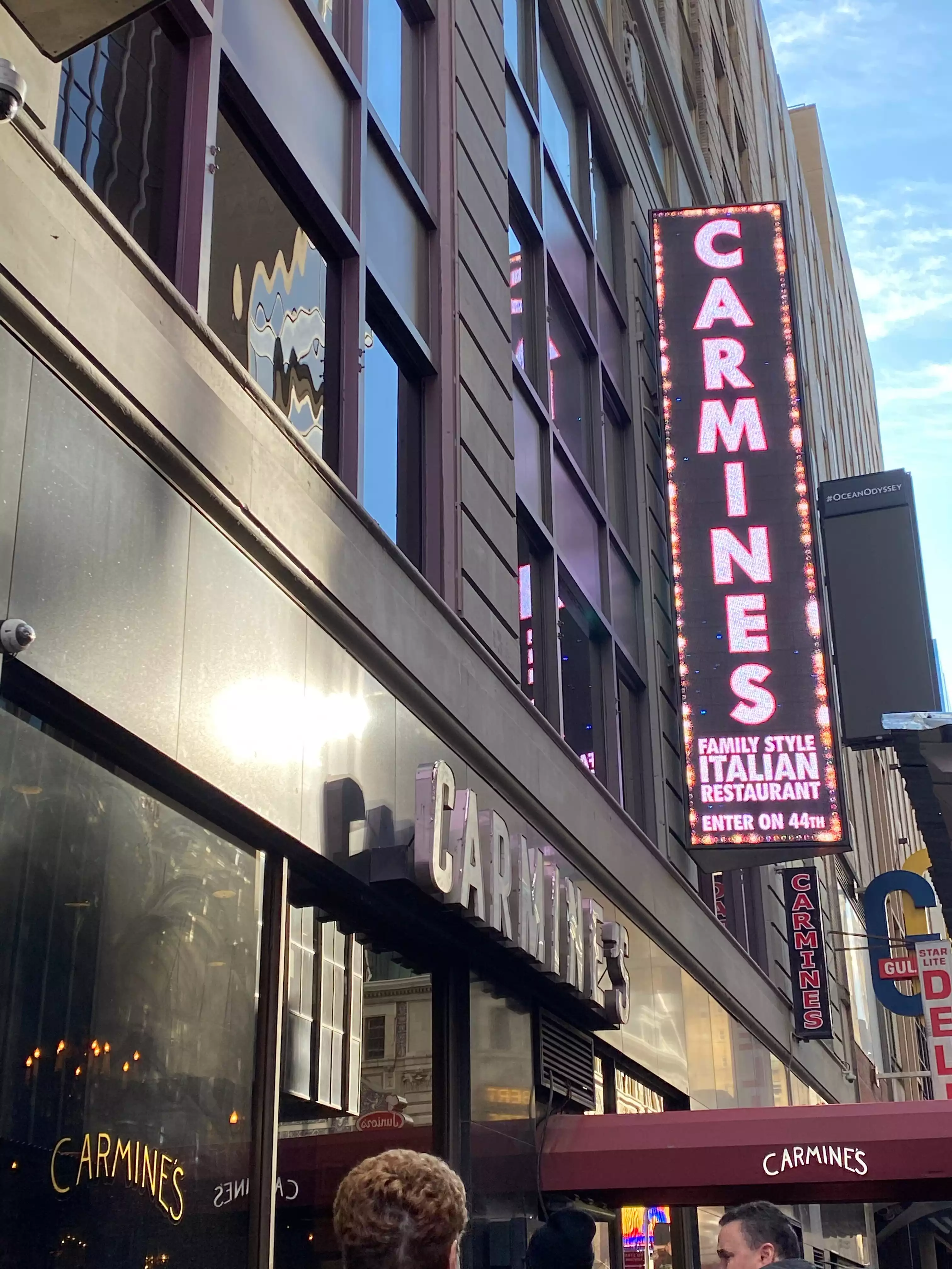 We were in NYC visiting friends for a couple of days and were trying to figure out dinner on our last night there, (01-01-20). AS many places were closed, we decided to take out and eat in. They recommended Carmine's and it was wonderful. We ordered a wonderful chicken dish, linguine and garlic bread. The order was enough to serve four, very reasonable and delicious. When we arrive to pick our order up, the bar was packed and there was a line to get in. Our friends frequent Carmine's ofter and now we know why; good food, healthy portions and reasonable fare for NYC. Hope to try it again when we visit.