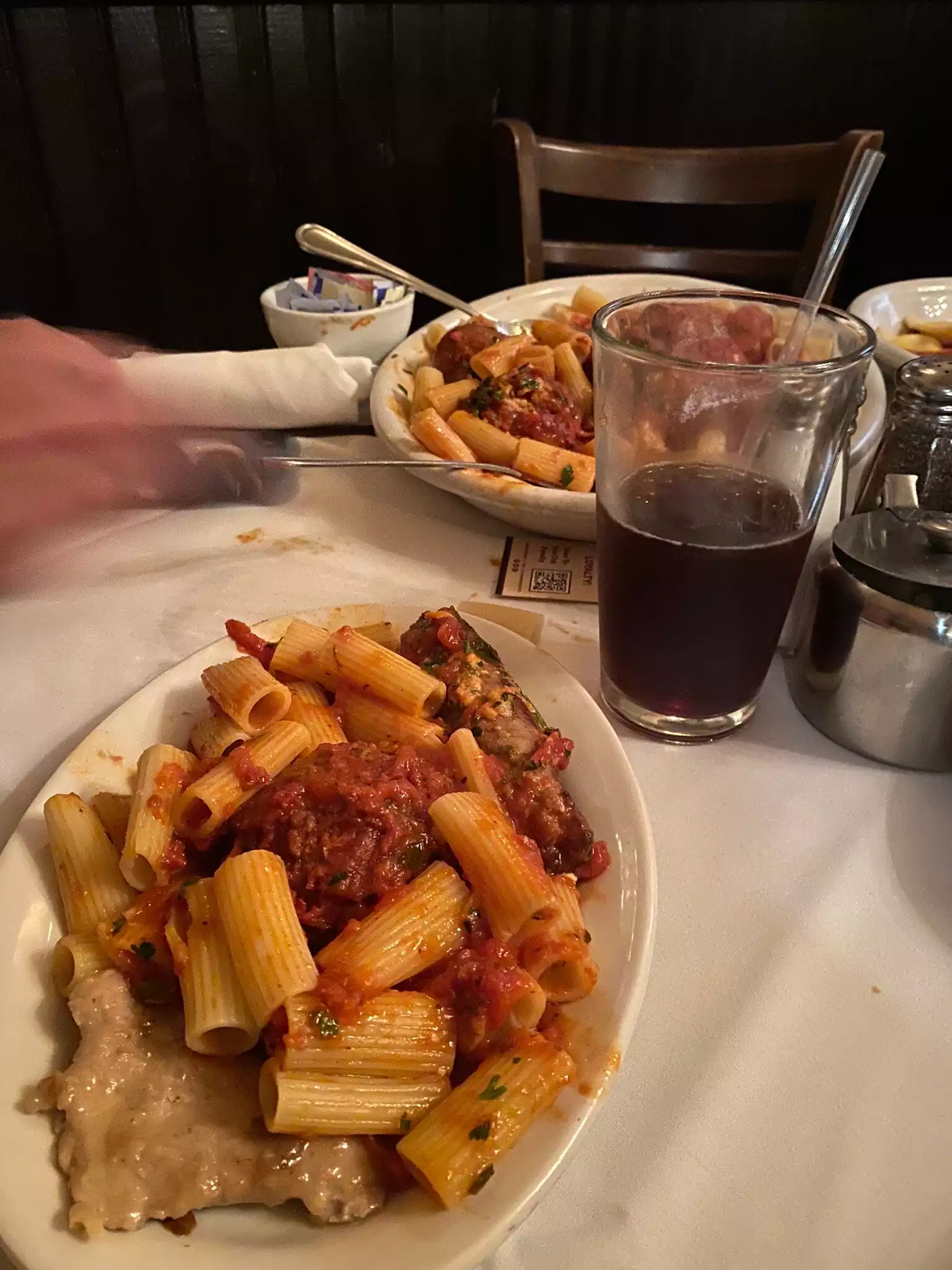 My husband and I visited Carmine’s for dinner on a quick weekend trip. We arrived early for our reservation, to discover it had been accidentally canceled. Nonetheless, we were seated in the main dining room exactly on time after a seat at the bar. We drank the Italian Manhattan at the bar, and it was delicious. We settled on rigatoni and meatballs as our meal. All dishes are served family style. We did not get a salad, and we were happy about that choice, because the rigatoni alone could have fed 5 people. I also got a strawberry sparkler with my meal. It was fantastic, too! I can’t think of anything that could have made this meal better. Highly recommended. The servers were also extremely friendly and good. So glad we made this choice.