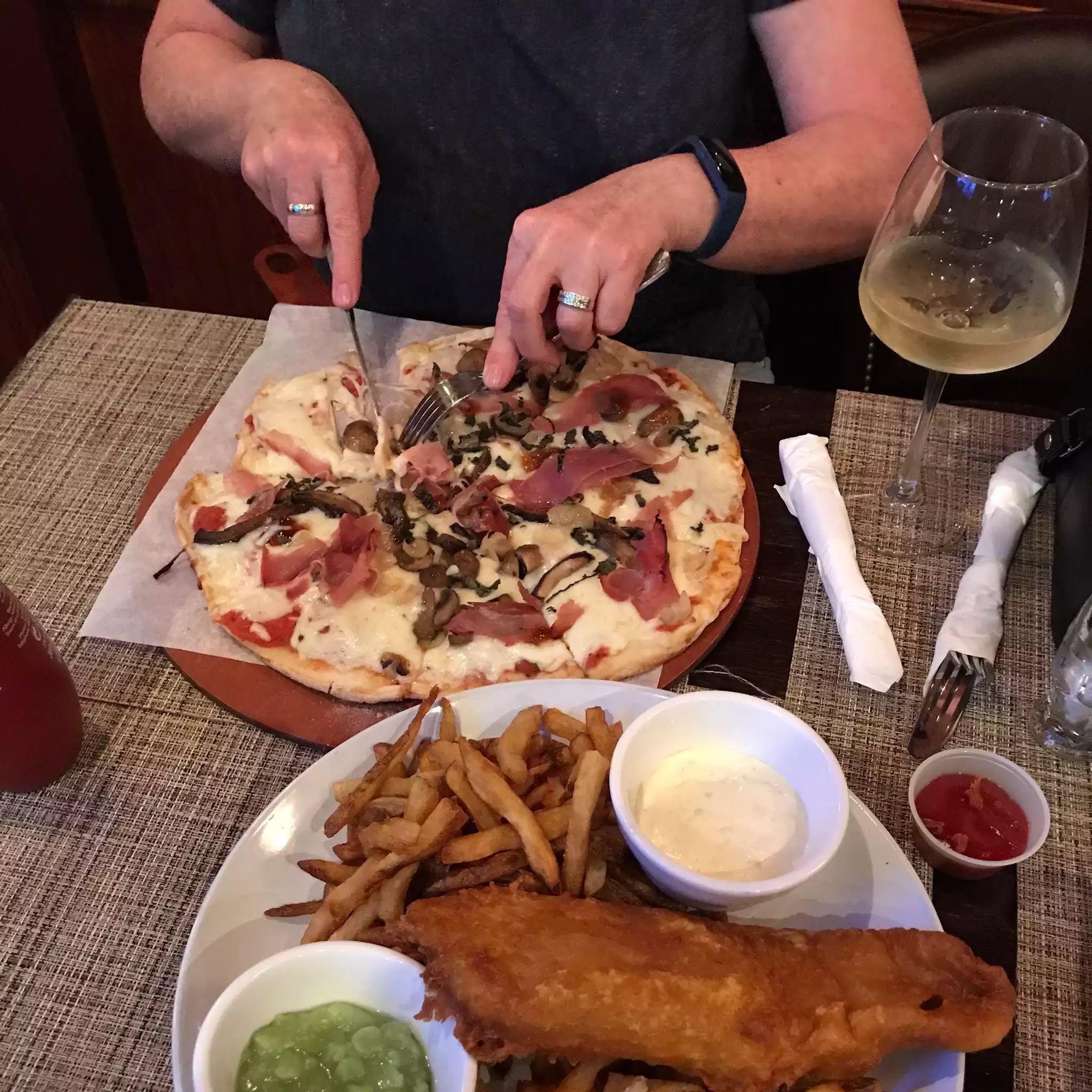 After a long and trying day, the food was great! We were greeted by friendly staff and good service. A great sports bar atmosphere and great for families. I had pizza which was very flavorful, and my husband had the steak sandwich which was also great!
