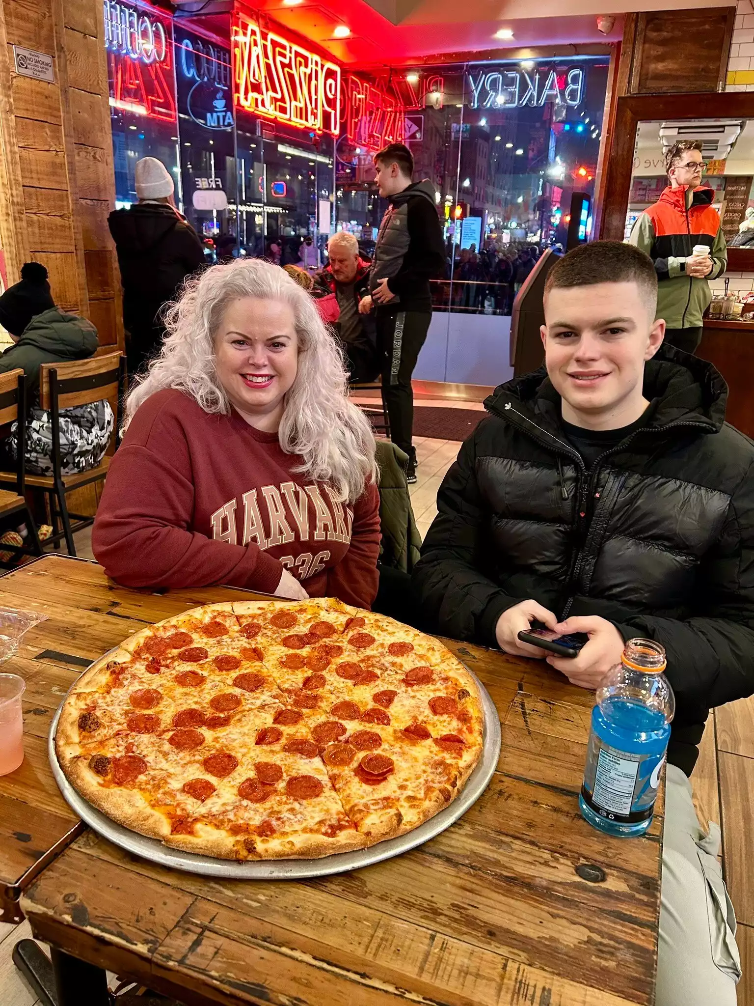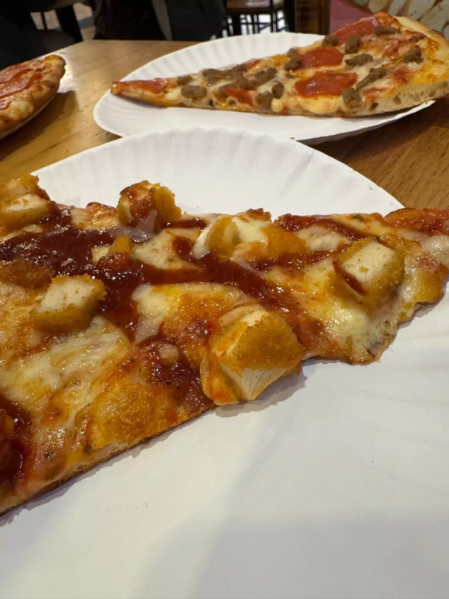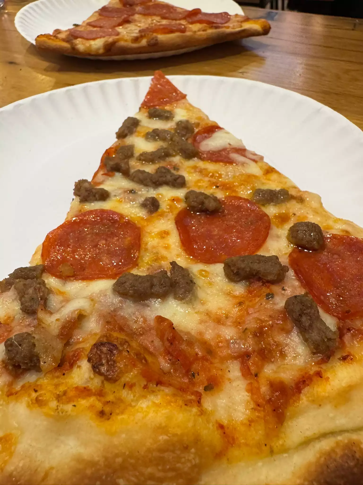Good Pepperoni & sausage sausage pizza. The sausage was kind of bland, but the pepperoni was great. The chicken noodle soup was just like mom makes! Delicious. The staff was help and friendly. It’s close to Times Square & Theaters. It also has tables to sit at, unlike many of the other local pizza places.