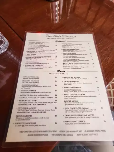 Myself and my family had dinner at Casa Bella twice during our trip to New York. Both times the service was wonderful and the meals were amazing. I personally have to be on a strict Gluten free diet due to allergy and I'm happy to say the Gluten free pasta was amazing and defiantly 100% gluten free.