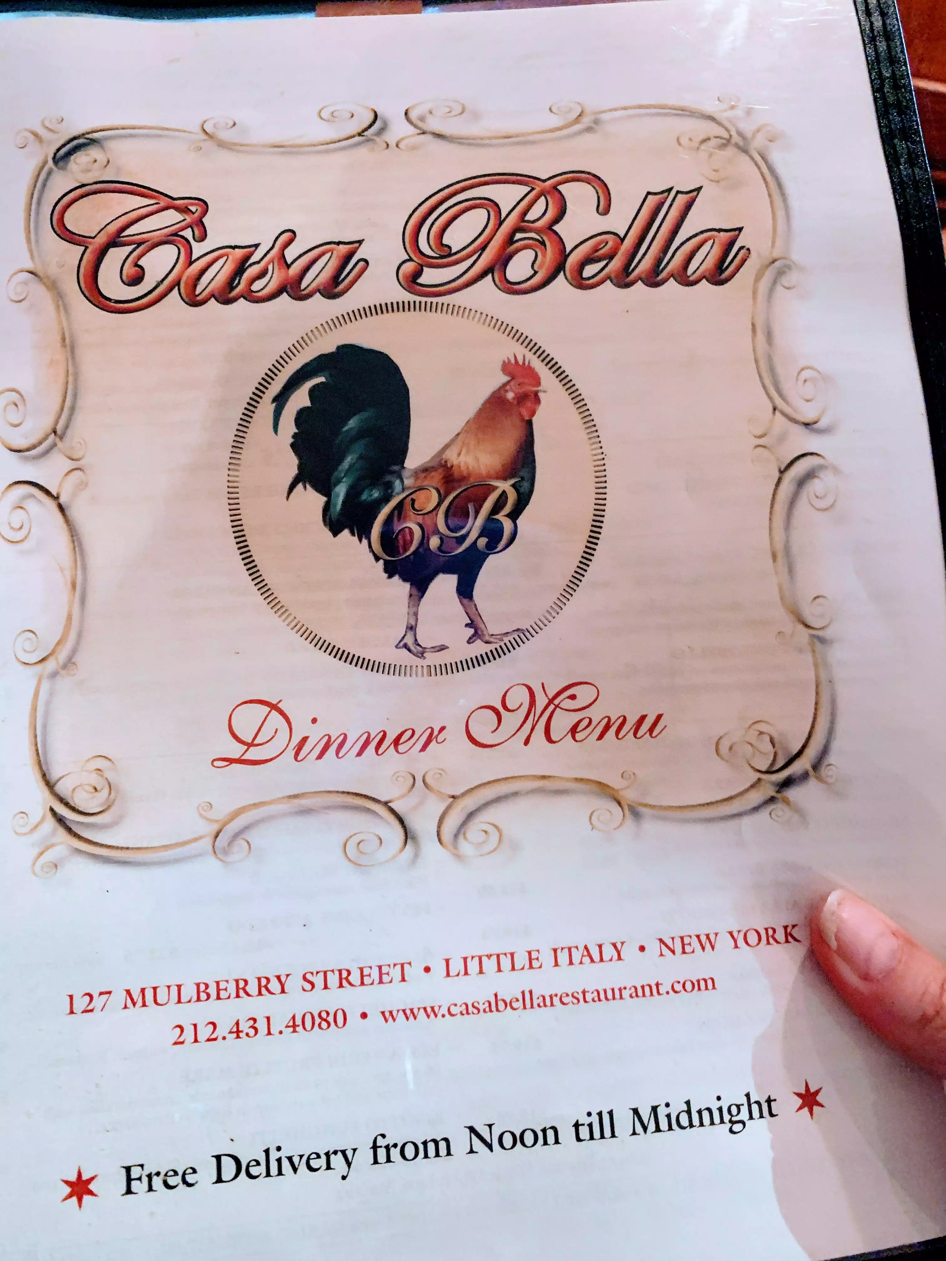 So here we are at the 92nd Annual Feast of San Gennero in Little Italy.Blue sky, crowds of people and a delicious smell of so many different foods cooking in th air. First it’s the Hot Zepplle stand and I get there just as there coming out of the hot oil, so good. We walk and walk and, time for a sausage and pepper hero, the bread is wet from the juice of the onions and peppers but you can’t let anything fall out of that ( work of art ). So we walk, and all that walking really works up an appetite. Now the hunt is on for a restaurant for dinner, every location looked good to stop in, but there was that certain something about Casa Bella that said this is the place, and we were right. We were seated by a friendly host, and waited on by the staff almost immediately, who were also nice. The restaurant decor was beautiful, real Italian looking and the food that pasted our table looked and smelled fantastic. We ordered, and when our food arrived it was plated and presented wonderfully, and tasted delicious. After paying the bill and heading for the exit, we had the pleasure of meeting the owner of the restaurant. She was a wonderful woman and so concerned about how we enjoyed our experience. Seeing how the restaurant operates, you can tell she has had many years in the business. When you visit Little Italy in NYC you must stop in Casa Bella for dinner. It will be an experience you’ll never forget🍷Bon Appite