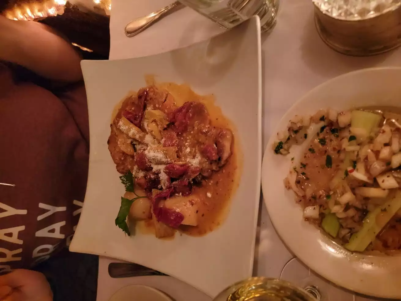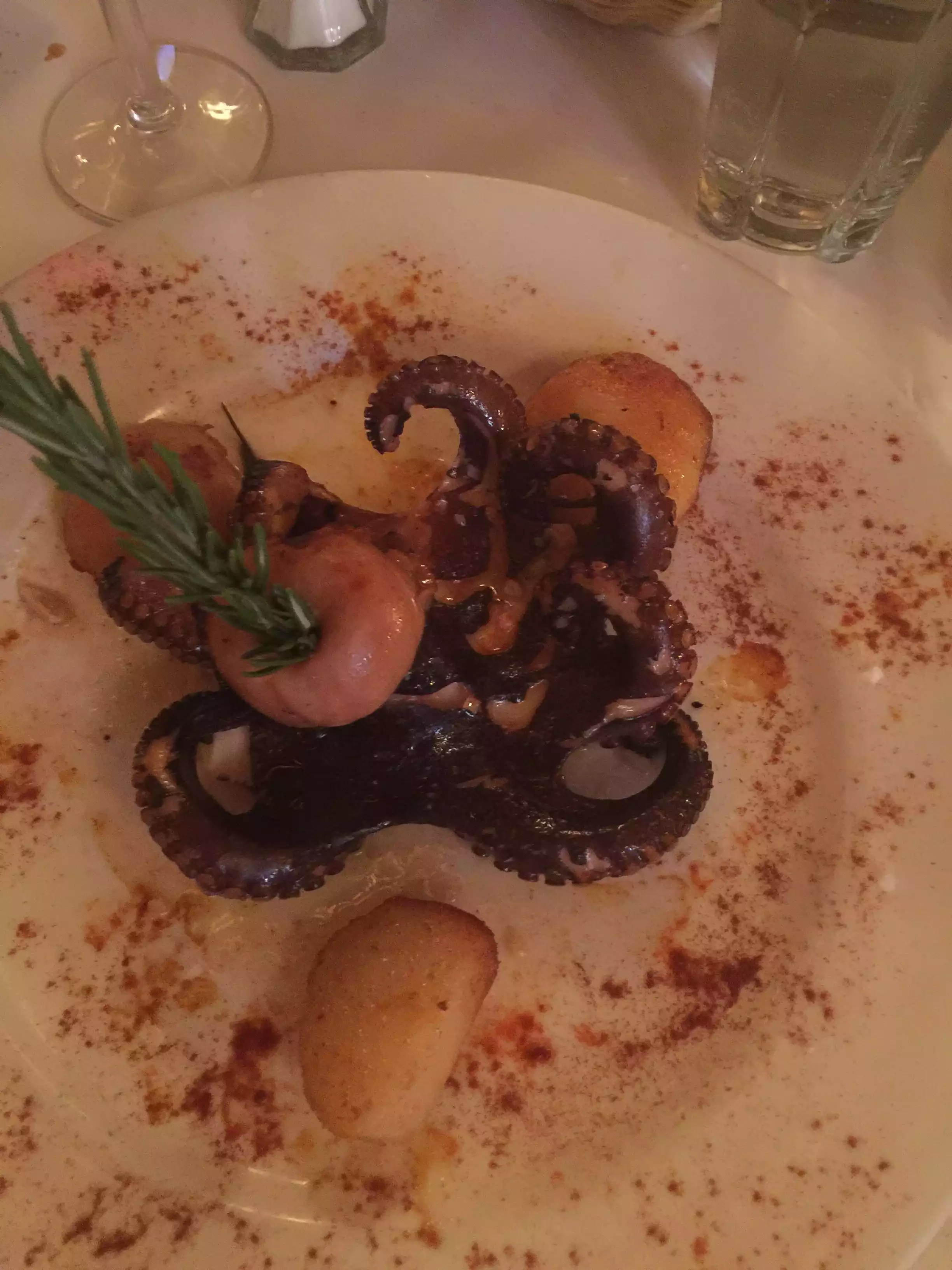 Ordered the octopus appetizer which was a special and not on the menu. The waiter came back to the table after taking the order to make sure we wanted it since it was $50, which I appreciated since that changed my mind. We had fried calamari instead, which was disappointing because it was large, chewy calamari rings, with no tentacles. Ordered the house wine, which was a cheap Tempranillo and okay. The problem was the half carafe was $20 (good deal), but the extra glass we ordered was $14 (terrible deal). The prices weren’t on the menu so we didn’t know until we got the bill. The menu is extensive, but totally lacking descriptions. I guess we could have asked. The veal saltimboco was made with spinach, which my husband wouldn’t have ordered if he had known. I ordered risotto with squid ink, which was tasty, but the risotto wasn’t all that well prepared. I really wished I had gone for a pasta dish instead. I was glad I had read a few reviews and was forewarned about the 20% tip already being applied, because it’s not mentioned in the menu or by the waiter. The restaurant itself is lovely and a little quirky and very cozy. I would go back and order differently, but, unfortunately, my husband isn’t in agreement.