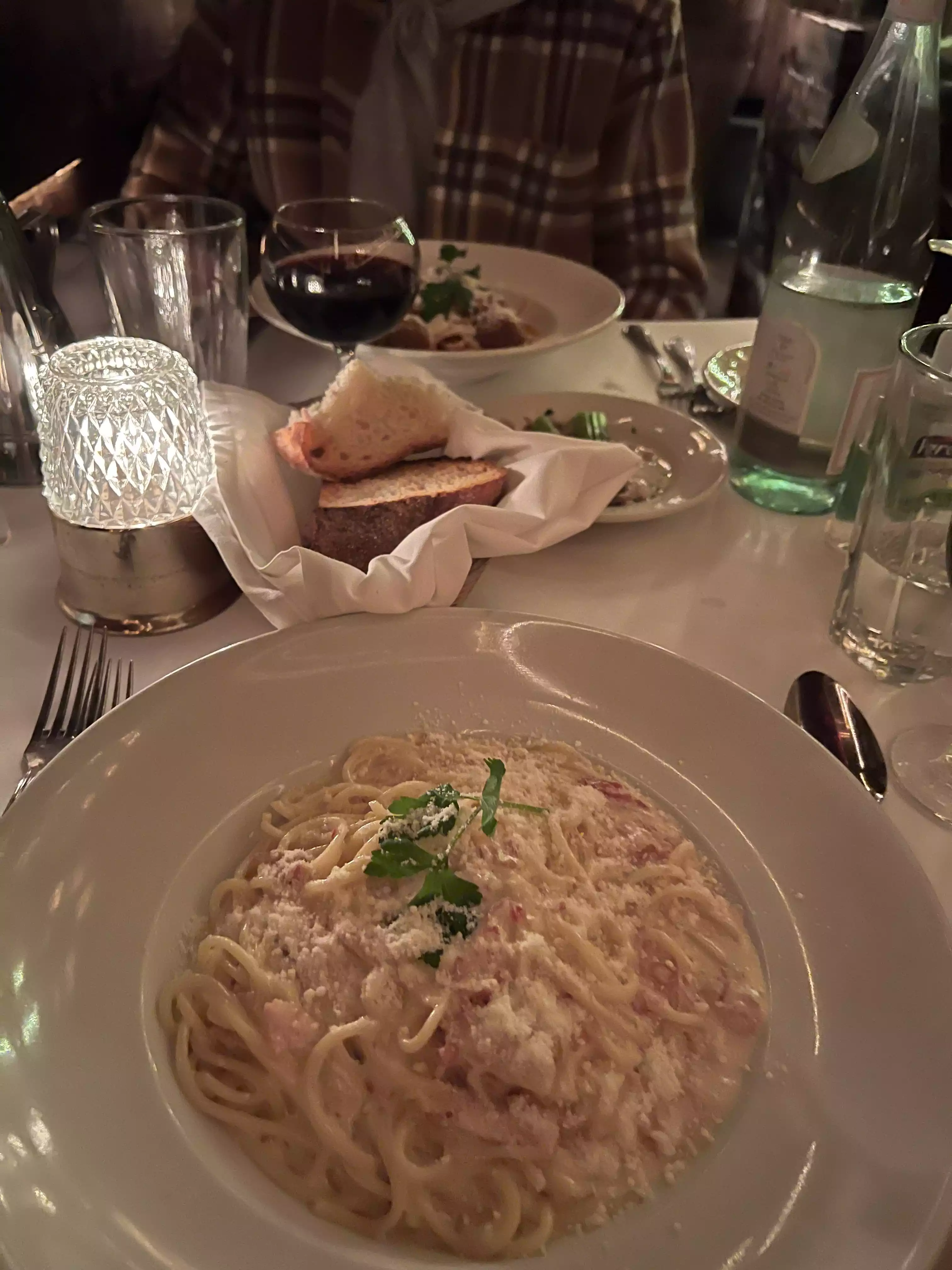We looked for several Italian restaurants for dinner and settled on this one since it was convenient and they offered Spaghetti Carbonara. Very intimate dining. Seating capacity is probably no more than 25. Wilson seated us and promptly brought bread and celery in herbs and olive oil along with a bottle of water. We ordered a small carafe of house Chianti which was extremely pleasant. I ordered the Carbonara and my wife ordered Capellini with shrimp and arugula. Both dishes were wonderful and the pasta was cooked to perfection. I’m very picky about my Carbonara and I would give it an 8.5. We finished with Lemon Sorbet and Spumoni. I would recommend this restaurant for any small occasion.