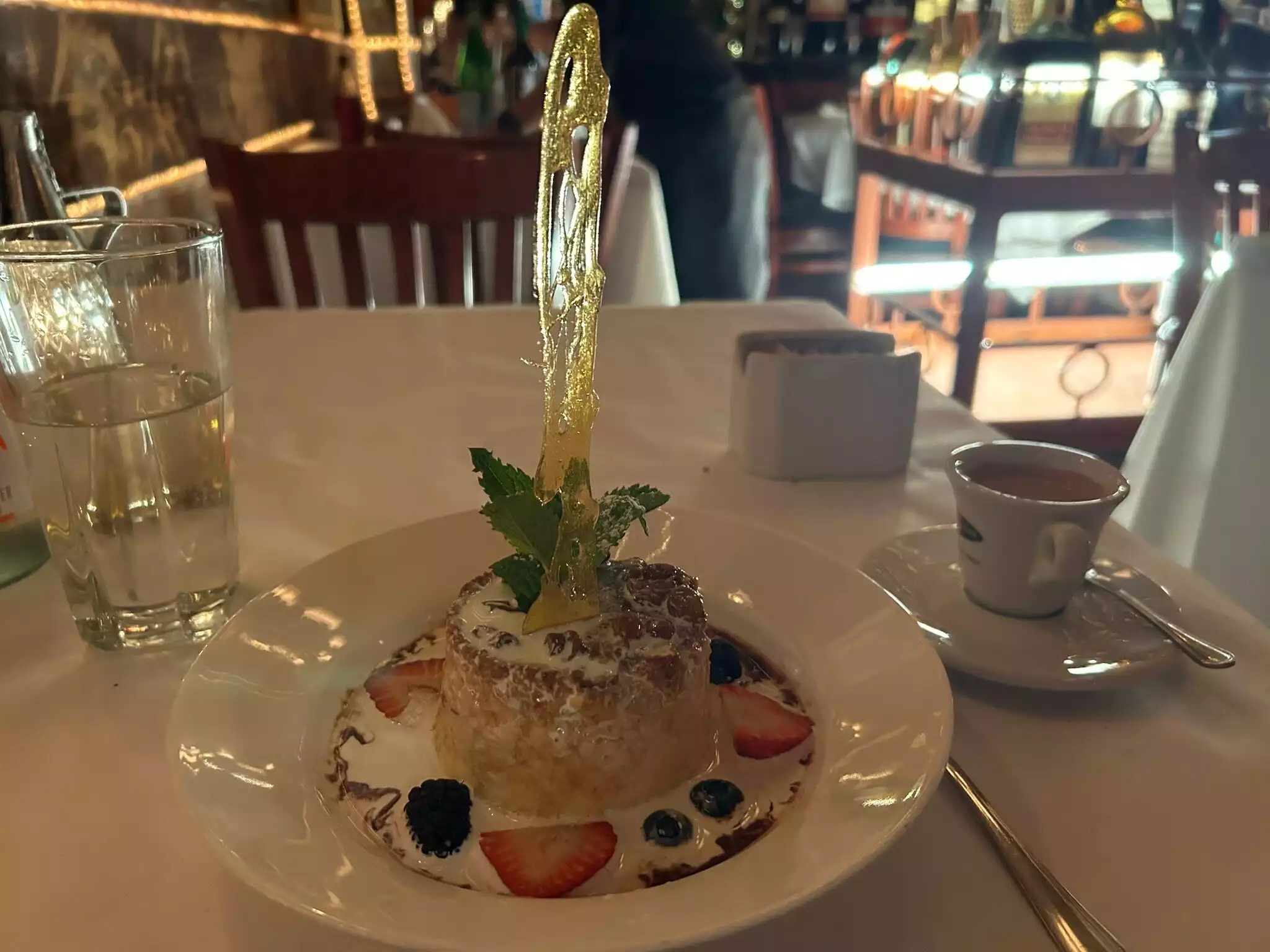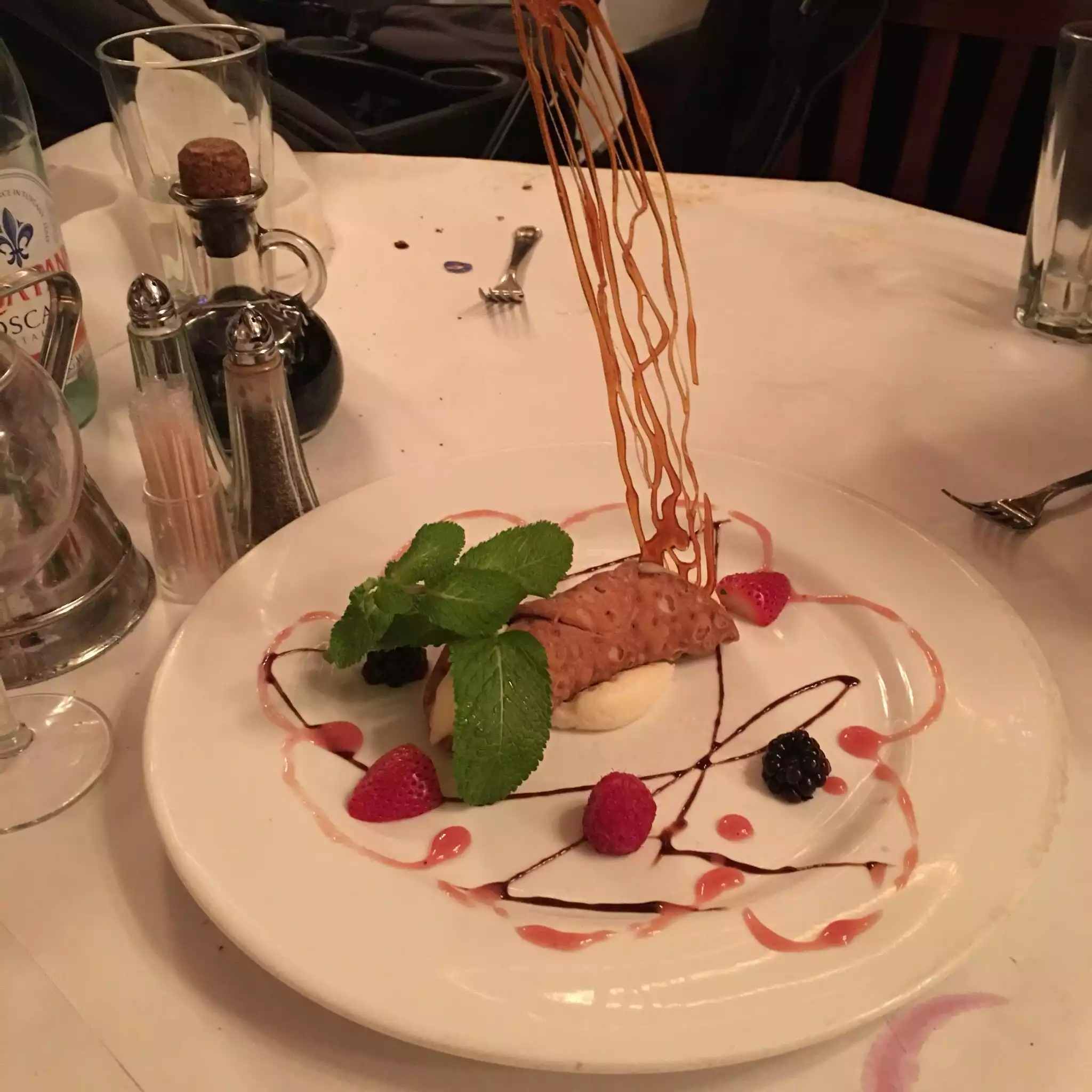 We ate there with friends. We were looking for a cozy place and we were attracted by the decor. Once there we quickly realize that the boss, former lookalike of Elvis, is unbearable! We ask for sparkling water and he immediately brings 2 bottles of San oelligrino which he pours abundantly in the event in the glasses. Same toppmo with the beers peroni. Each bottle will be charged $15. Total: $75 in beer and water. Pasta was passable Desserts, frozen, will be charged $20 each Very salty note Atmosphere dinner bad show from the boss To flee Scam!!!
