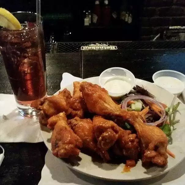 Husband and I stopped here after arriving in NYC. We were looking for something casual, quick but quality food. We found this restaurant nearby using Yelp. The atmosphere was exactly what you would expect for an Irish pub...very warm, dark and cozy. We were greeted immediately and sat at a bar table. Server was friendly. We ordered beer, iced tea, and chicken wings to share. Drinks were served quickly and as expected. Chicken wings were served in a reasonable time. The chicken wings were average tasting. Pretty basic. Nothing special. However, we did find a very long, dark hair in our order which kinda killed my appetite. Coincidently, the waitress had long, dark hair. Overall, our experience was just average. I wouldn't go back but I guess it's unfair to judge a place solely on one plate of chicken wings.
