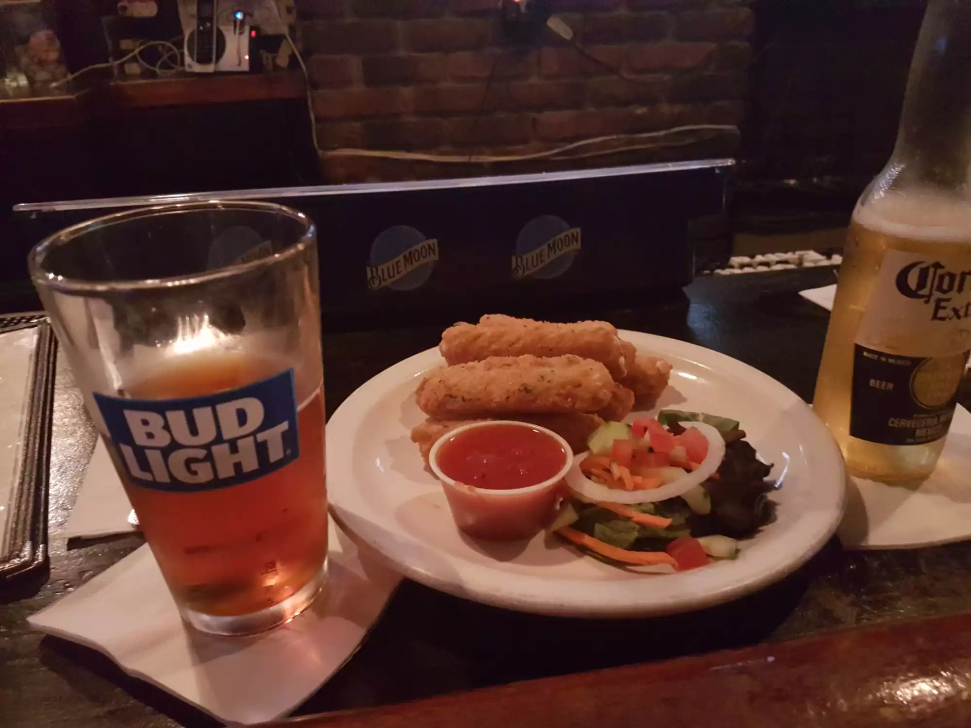 Negative: Our waitress was pretty ditzy and really didn't know much, nor was she on top of things. I ordered a Long Island and it was disgusting. I had to mix it half and half with a diet coke to make it halfway tolerable (and I'm not a wimp about drinks). Tacos were super spicy (too much for our 11 year old son). Onion rings were THE BEST! YUM! Overall... average pub with bar food... nothing super special but good meal.
