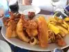 Friendly staff, delicious shellfish combo dish, festive atmosphere with live music! Great place to eat after just getting off the plane!
