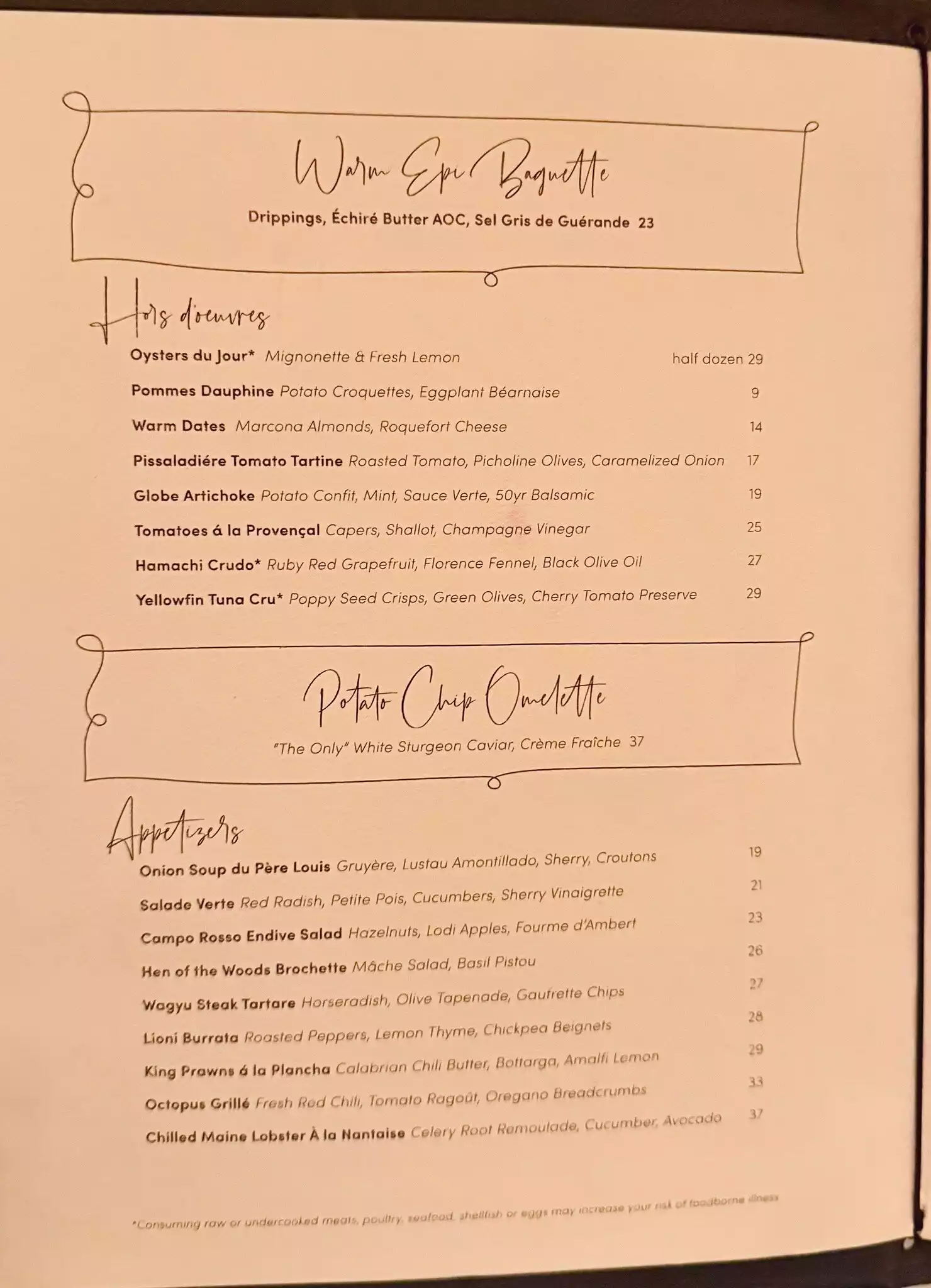 We had a wonderful experience. Food and service were on point. We enjoyed all the dishes. Started with delicious baby artichokes and the innovative potato chip omelette which was enhanced by the addition of caviar. We shared the bouillabaisse and the rotisserie chicken. Both were delicious and were generous portions. The bread on the table was a satisfying warm loaf of goodness. Our waiter was knowledgeable and attentive. We keep getting checked on by what I assume was the manager who made sure we were happy with everything and was pleasant to chat with. He gave us a brief and interesting history of the restaurant. I look forward to a return visit.