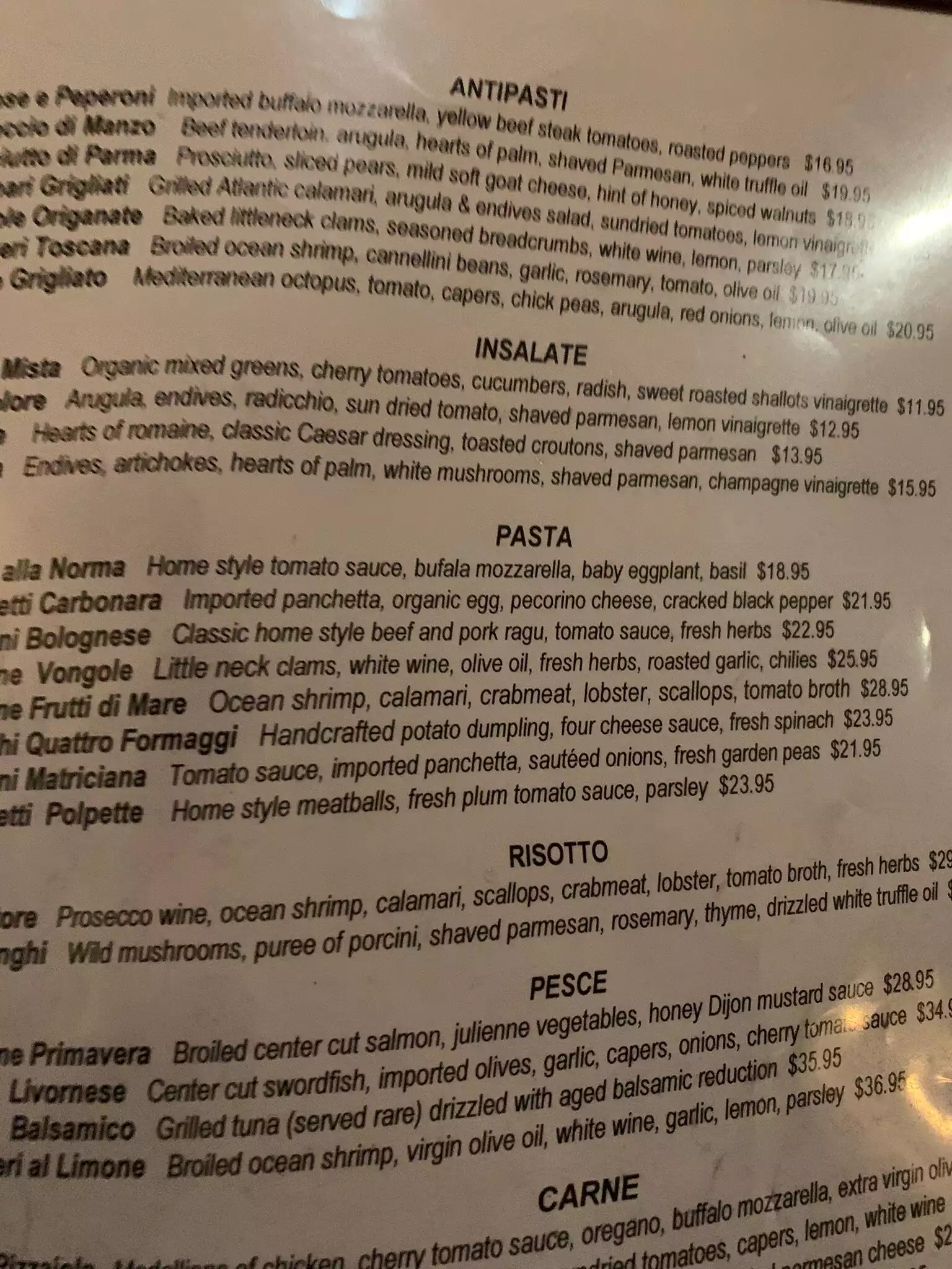 Not as great as I recall on last visit - food was too salty and over cooked. Overpriced for mediocre Italian. Won’t be back