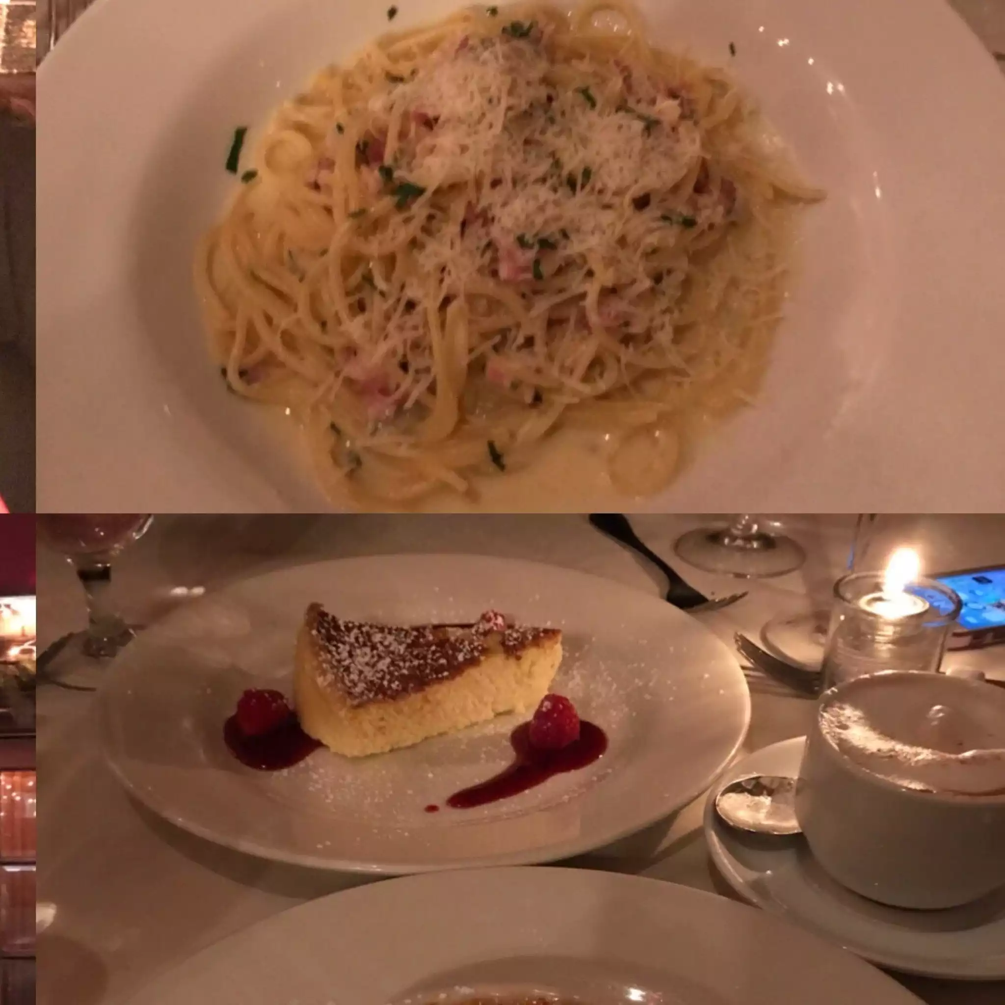 I made reservations for my family because of the proximity to Rockefeller Center. Less than a 10 minute walk there. The food was excellent and service was okay. We went on a Friday night and it was super busy not enough personal service for the price that we paid, but the food really made up for it. Our Cesare salad was fresh and crisp. For dinner my husband and I ordered spaghetti Carbonara and the Vitello (veal) Parmigiano with a bottle of Sauvignon Blanc. The waiter made no attempt to show us the wine menu and the bottle was $50. Both of my daughters had the risotto which they enjoyed. For dessert we shared cheese cake and Creme Brûlée. Both delicious. The only negative was that the service was rushed and not very personal. One of the waiters dropped a handful of dirty dishes right behind my husband. This could’ve been avoided if they just slowed down. Also, we got our check as we were eating our dessert. Because of the service I give it 4 stars instead of 5.
