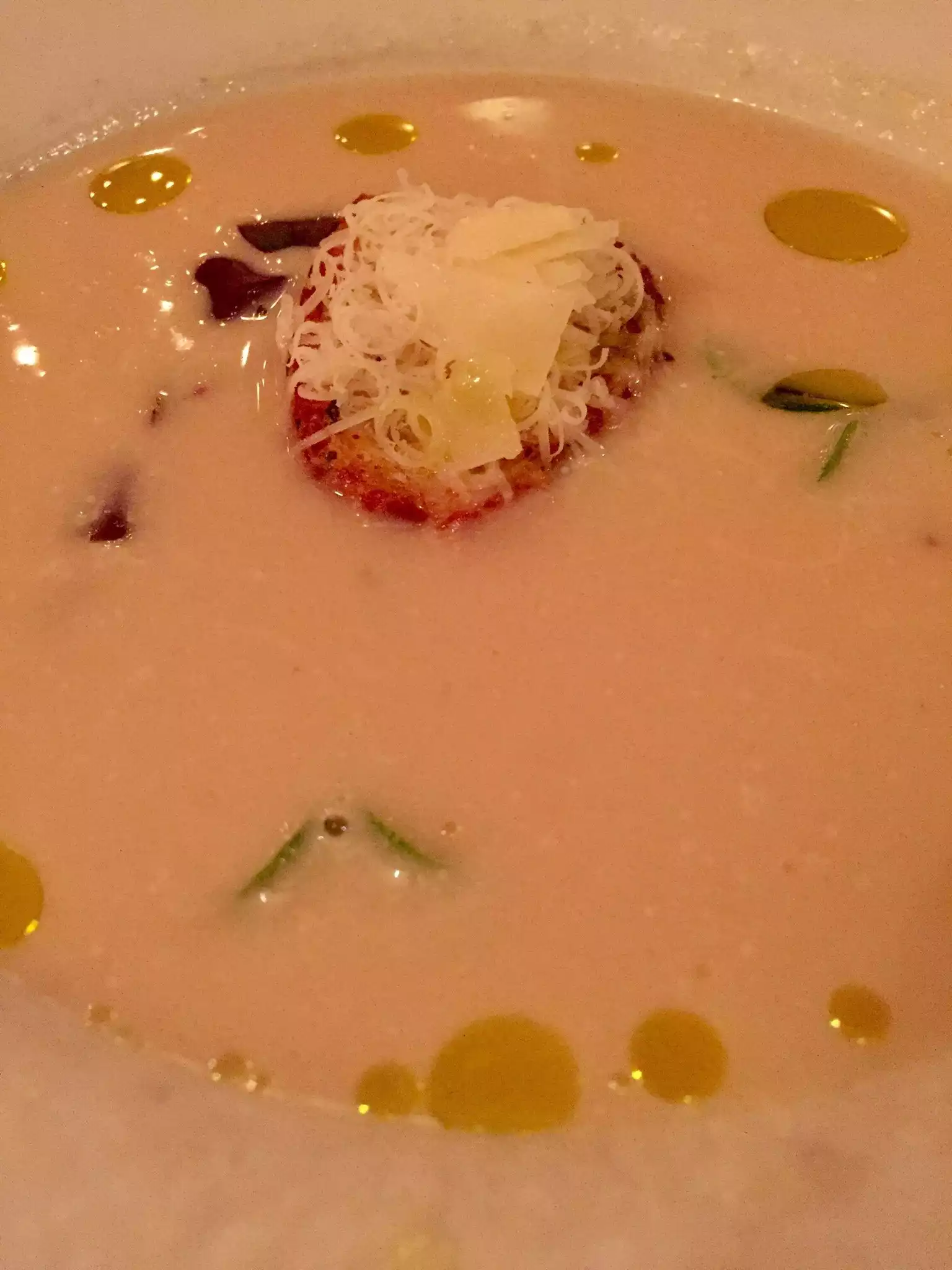 The white asparagus soup is well executed with a truffle flavor boost and a little crouton of bread with gratted parmesan on top. Nice and warm in this cold day Chicken Ravioli: one large ravioli filled with chicken and veggies. Nice and smooth. A good filling simple dish