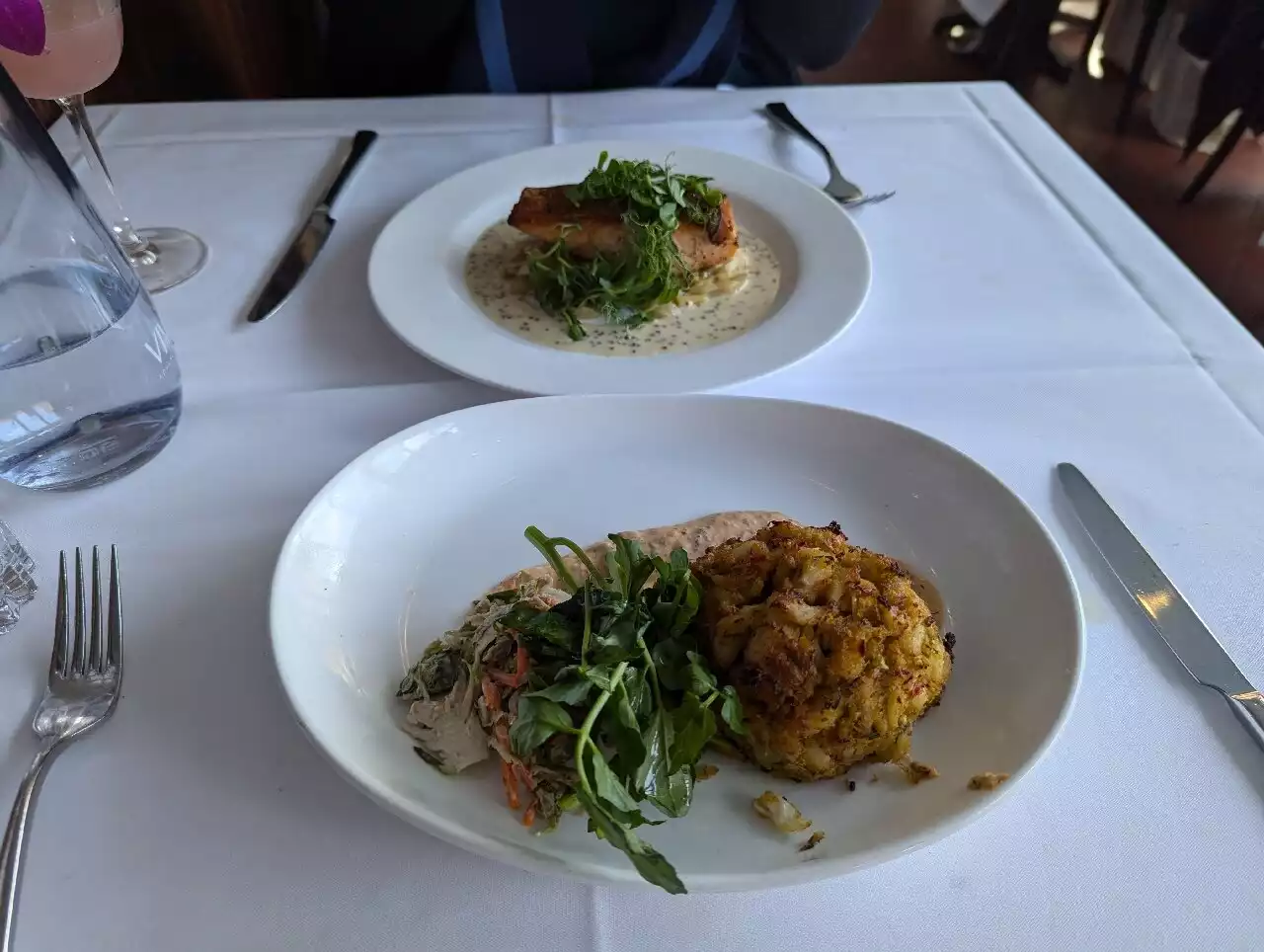 This was a very nice experience with a great View good food and good service. I had the roast to duck which was very good my wife had the lump crab cake and my son had a the roasted chicken and it was delicious