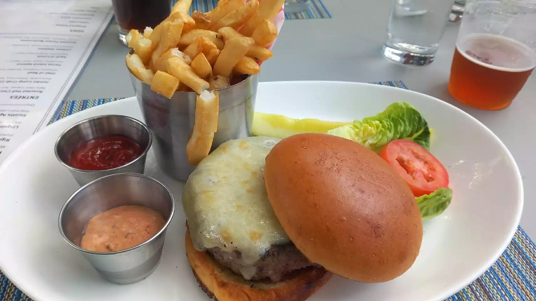 We walked in and were offered a table which wasn’t immediately next to the water but still had great views of the lake. The food was ok, I had the traditional Benedict, my husband the quiche and the kids had a burger each. They were chuffed all the extras were on the side so they could add what they wanted to it. Quality was ok and yes it was expensive for what it was but the views (and a/c) made up for it. Service was over the top for us brits, but that is probably ok for Americans!