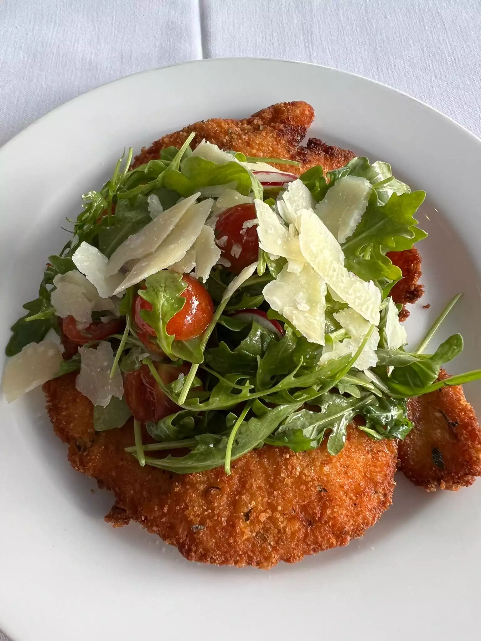 Mo was our waiter and he was excellent, suggested a rose glass of wine which did prove to be dry and excellent. My friend had crab cakes and loved it. I had the chicken Milanese which came with a salad . One piece was moist and delicious but the other piece was somewhat dry and overdone and I needed to ask for olive oil to add to it to make it edible. The view at the window table was wonderful and the jazz music was soothing after walking in 95 degree weather. This is fun for a one time experience but I feel other places for gourmet food might be elsewhere. I did appreciate the excellent service we received.